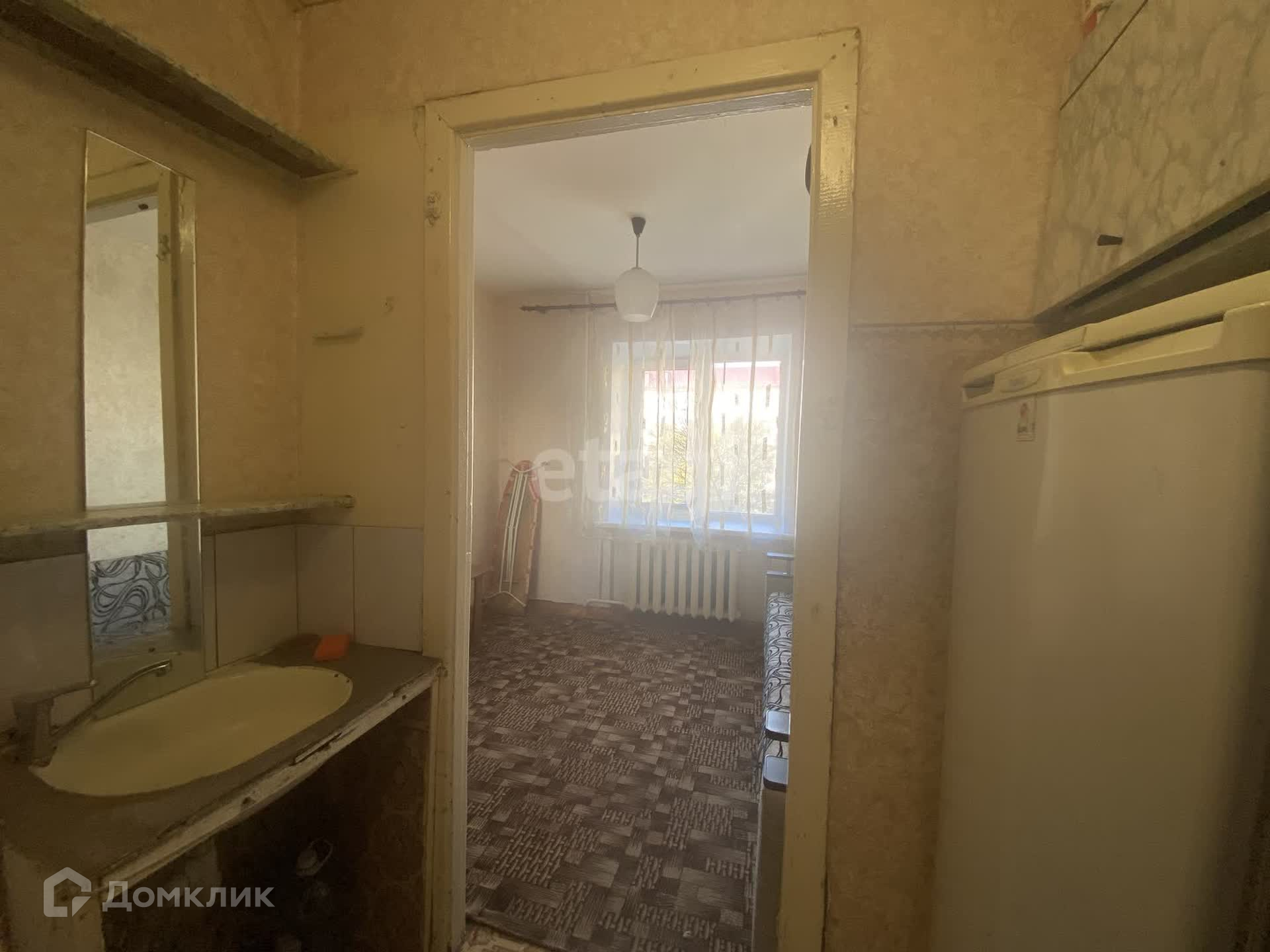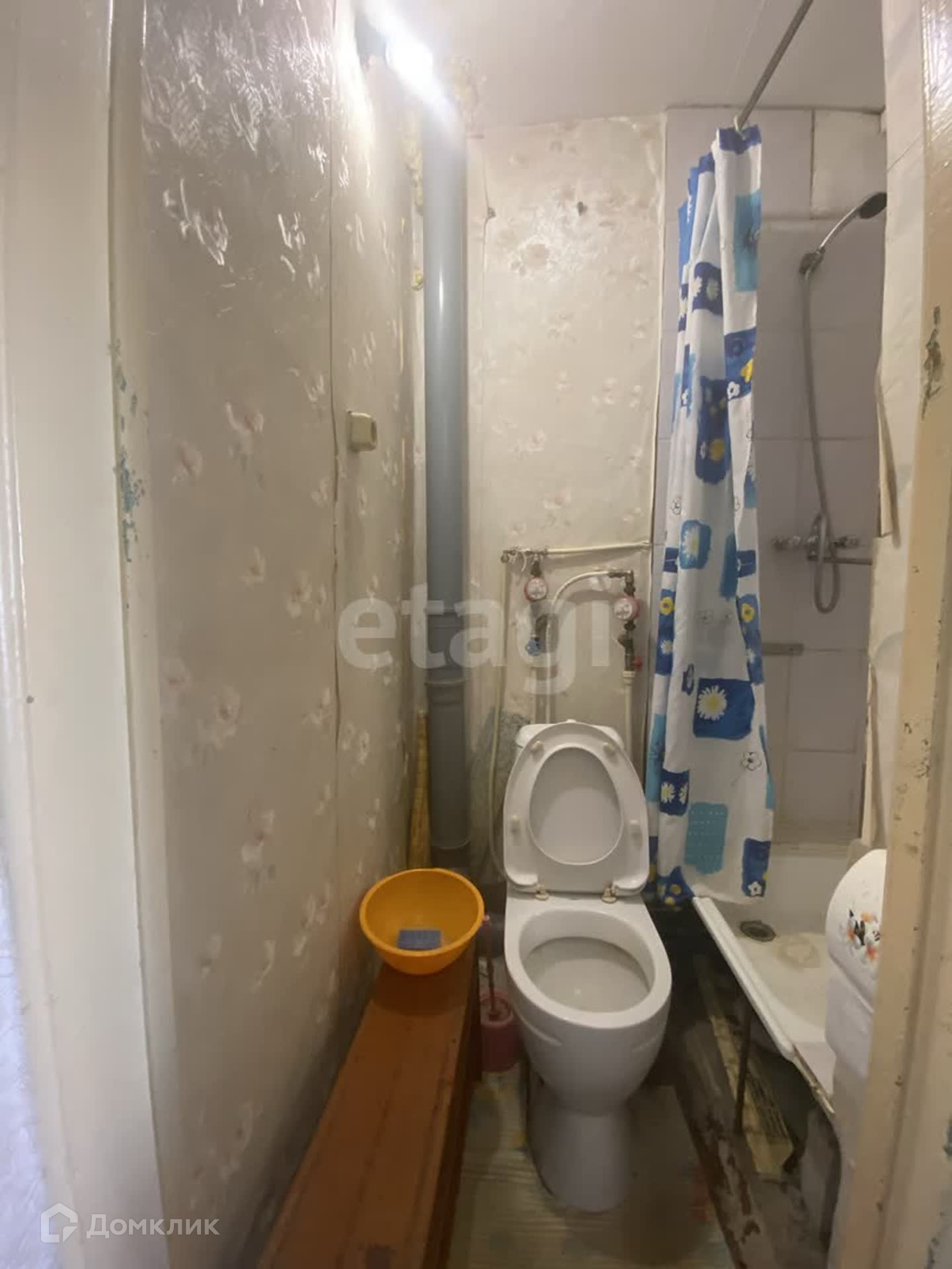 В комнате вода, туалет и душевая. Нужно обновить косметический ремонт. Стоят стеклопакеты.