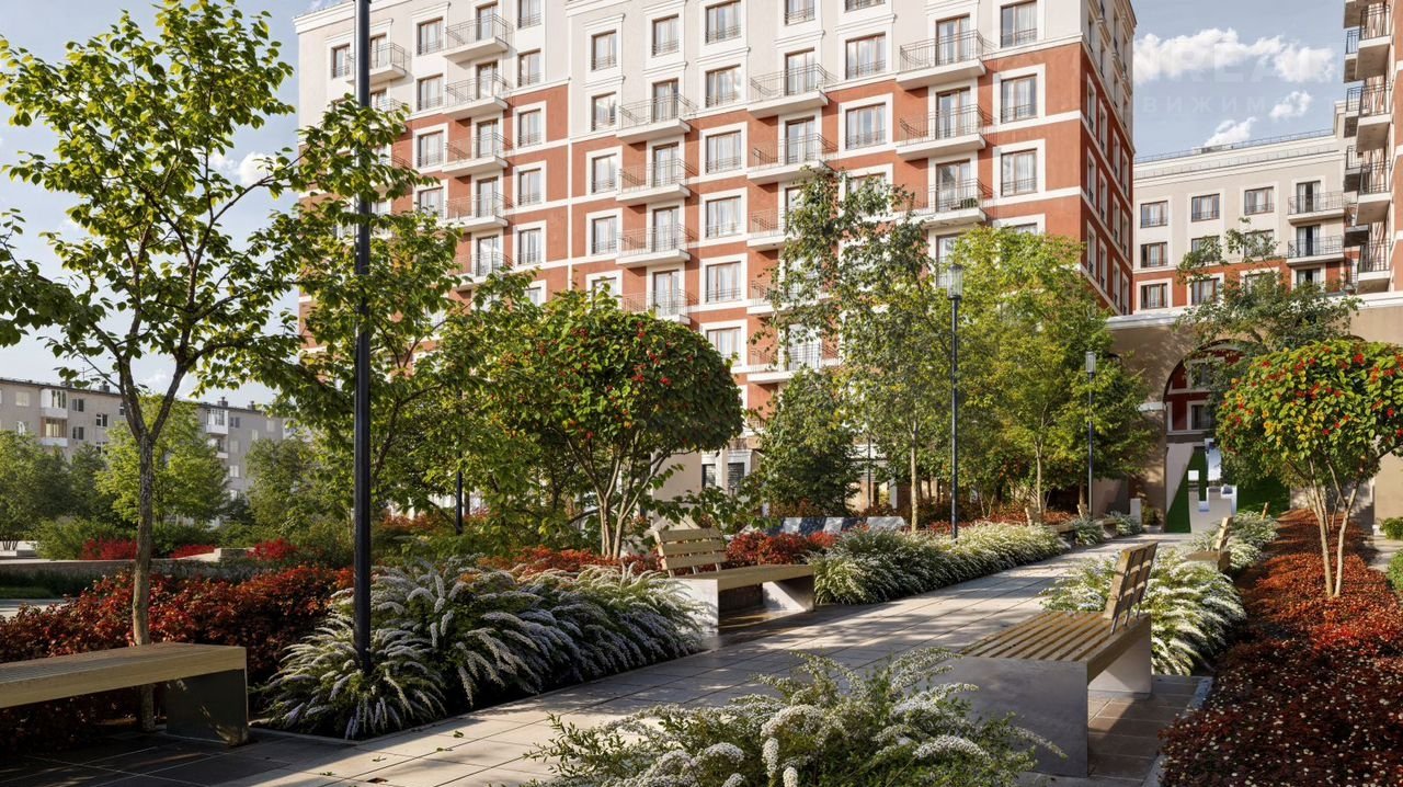 Большую часть территории двора занимает зелень. Растения представлены различными видами деревьев, кустарников, а также цветущими многолетниками. Зелень и стены дома выступают в качестве буфера, закрывая двор от шума городских магистралей. Ландшафт остается ярким в любой сезон. (АQID02506571)