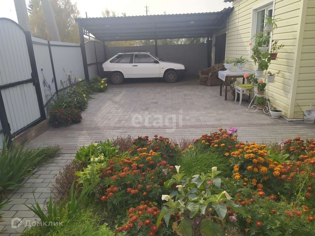 Через стенку имеется теплый гараж, на улице парковочное место для машины с навесом.