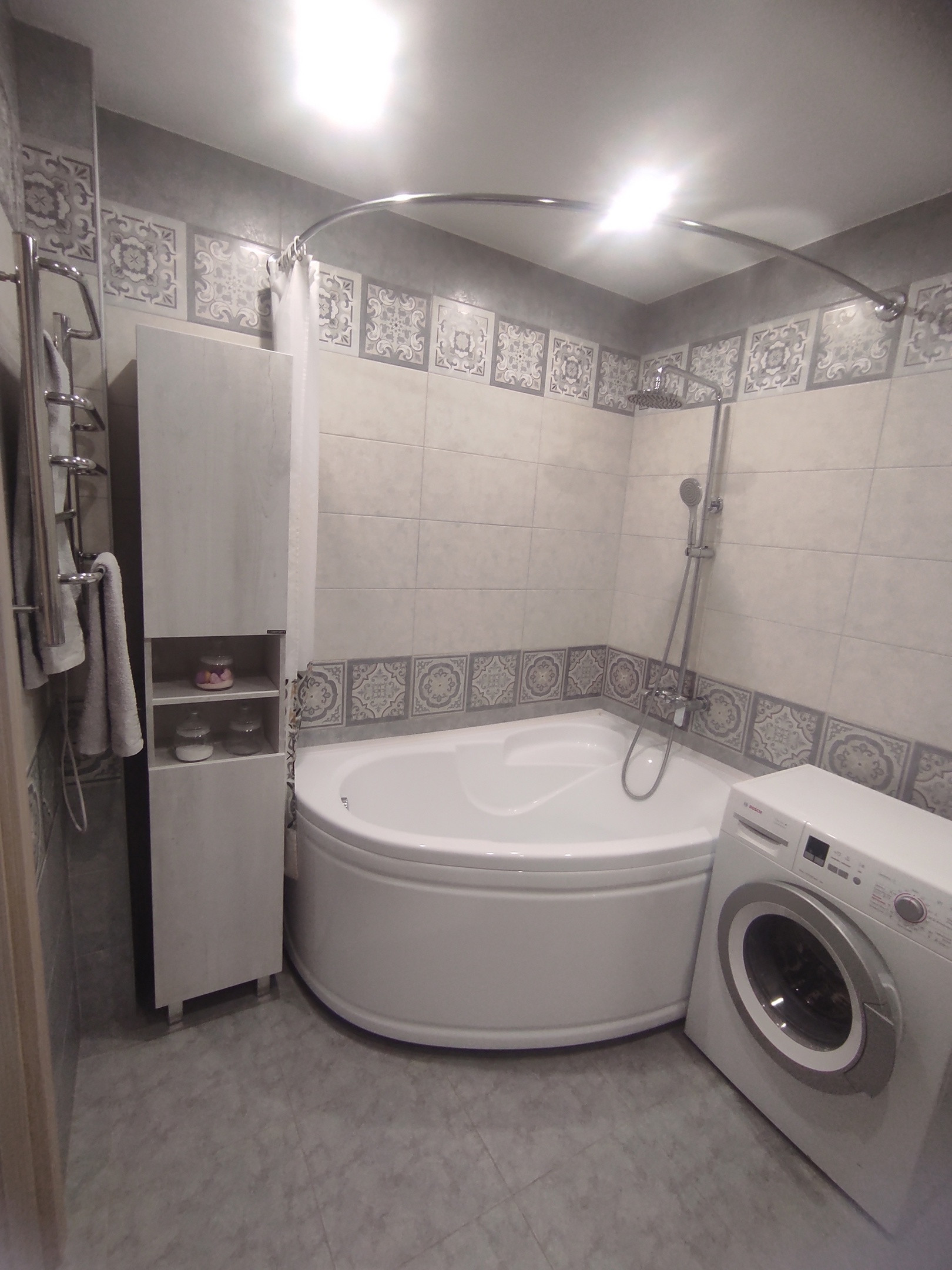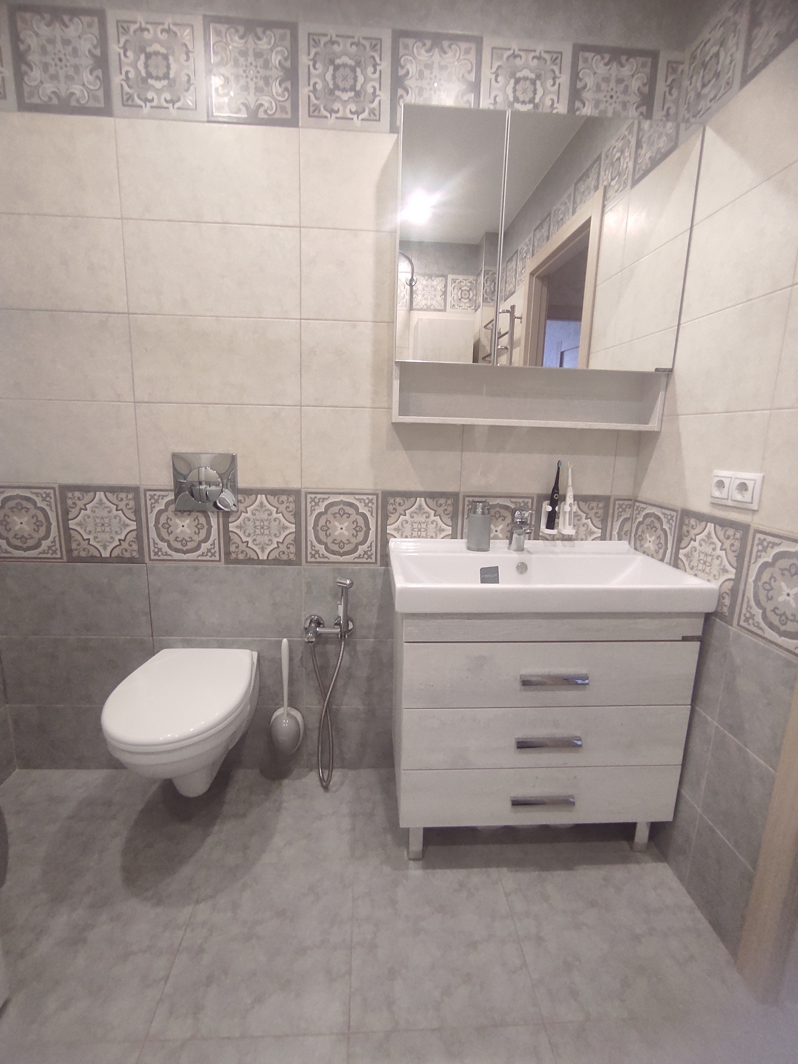 Ванная комната: плитка, натяжной потолок, современная инсталляция, гигиенический душ, тропический душ, качественная влагостойкая мебель и акриловая ванна.