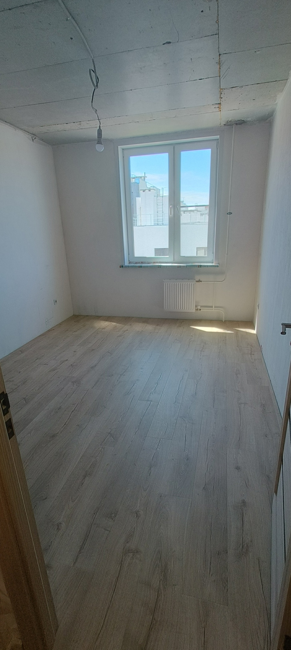 2-ая спальная комната: стены выровнены финишной штукатуркой и загрунтованы, электрика проведена, пол постелен (плинтусы куплены, но не сделаны). Нужно только наклеить обои и натянуть потолок.