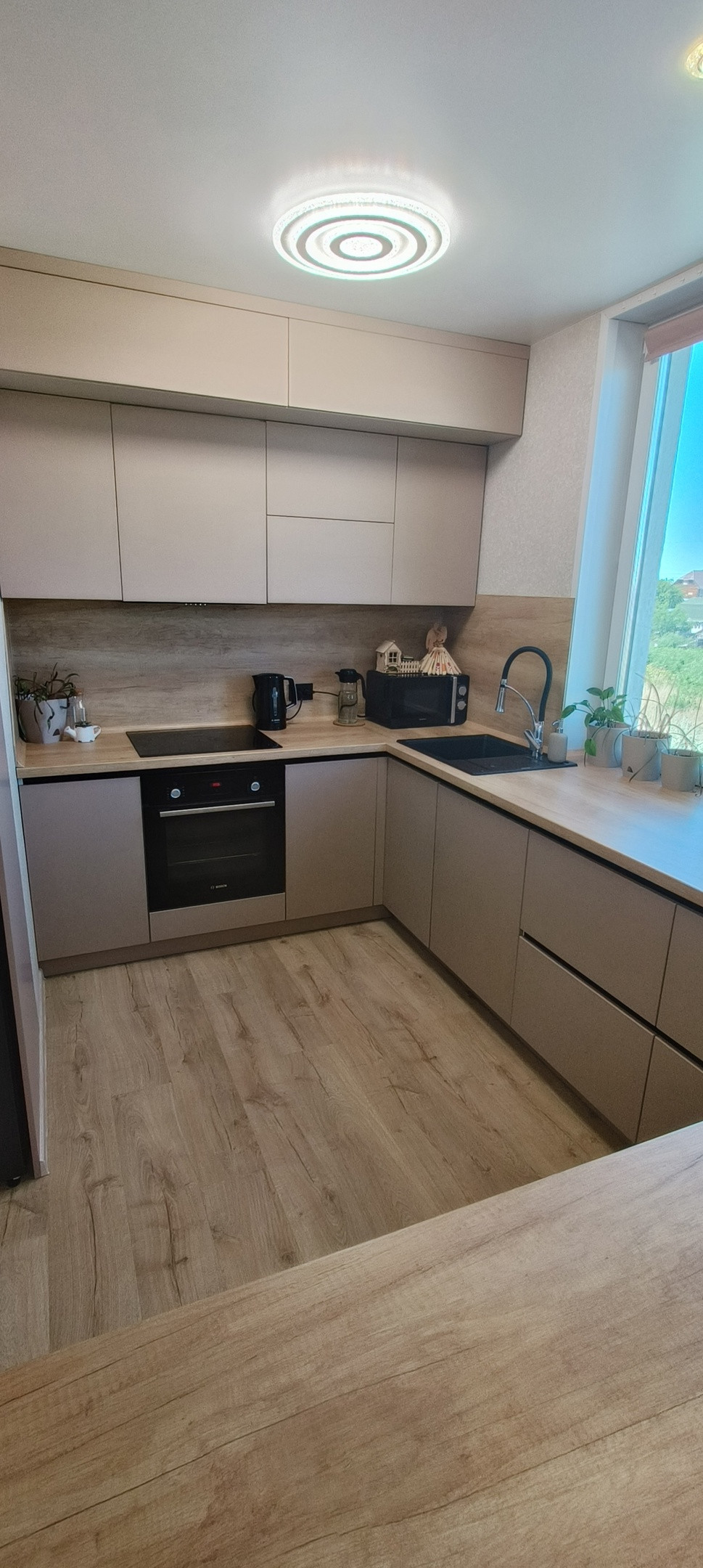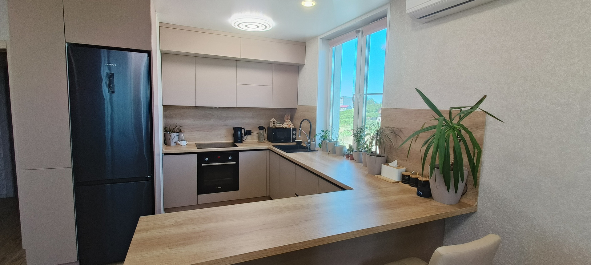 Кухня-столовая: вся мебель сделана на заказ, кухня из материалов высокого качества, доводчики, встроенная техника (варочная панель, духовой шкаф, вытяжка, посудомоечная машина), кондиционер.
