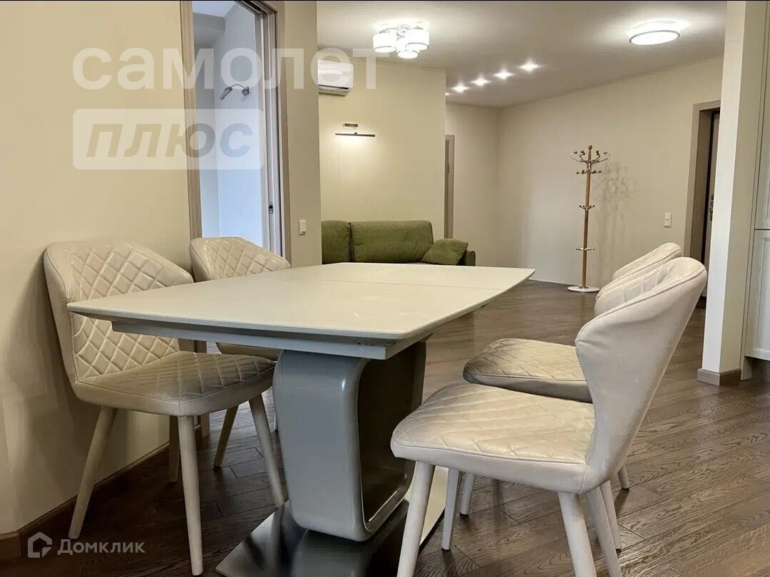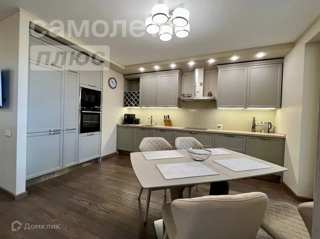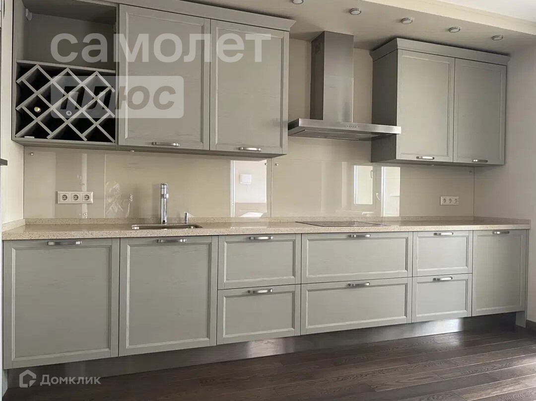 Кухня-гостиная 22 кв. м. со встроенной кухней из немецких комплектующих, столешница из кварцевого агломерата, встроенный холодильник BOCH, духовой шкаф NEFF, микроволновка NEFF, посудомоечная машина BOCH, вытяжка Kuppersberg, 4-конфорочная индукционная варочная панель NEFF, кондиционеры Denko inventer.