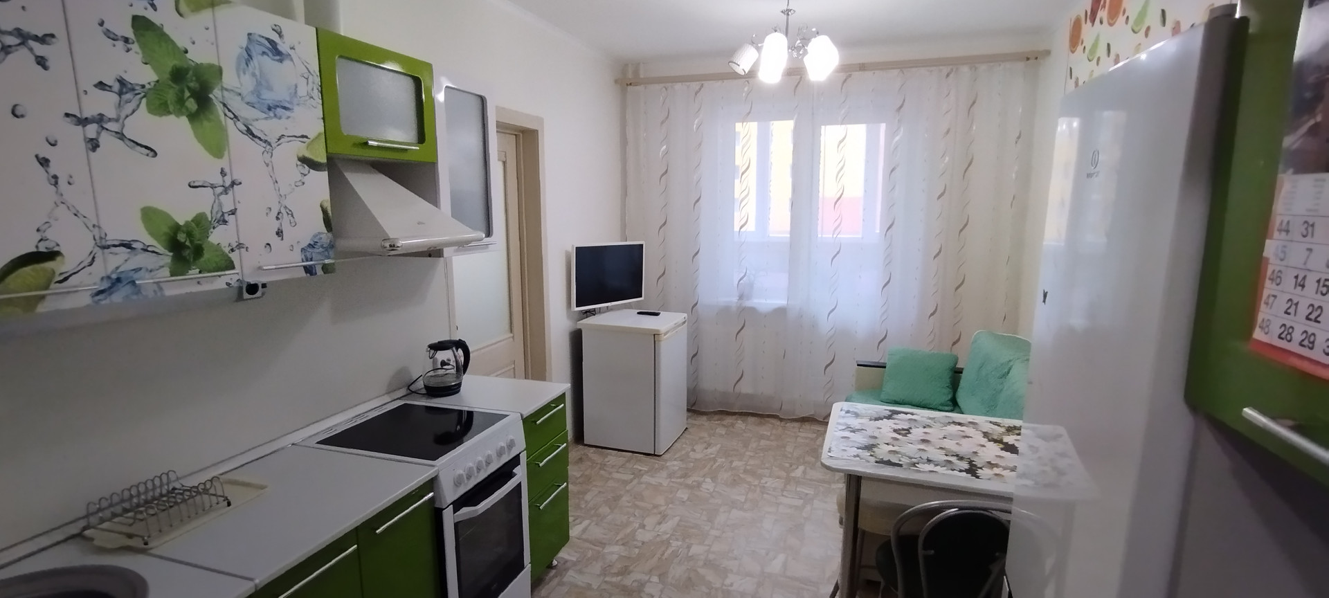 Остаются шкафы, все в санузле, кухня, холодильник, электроплита с духовым шкафом.