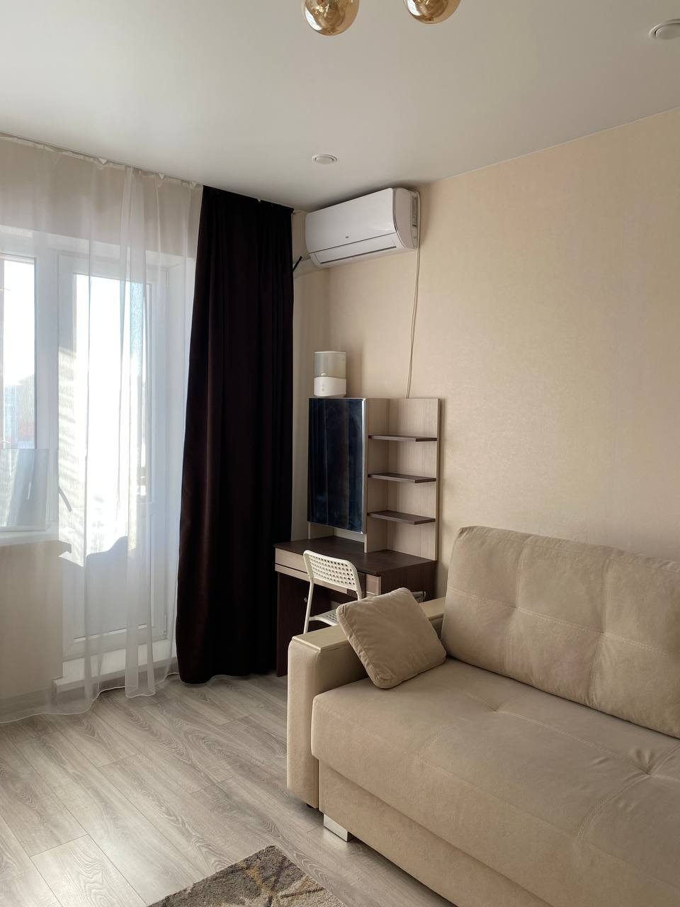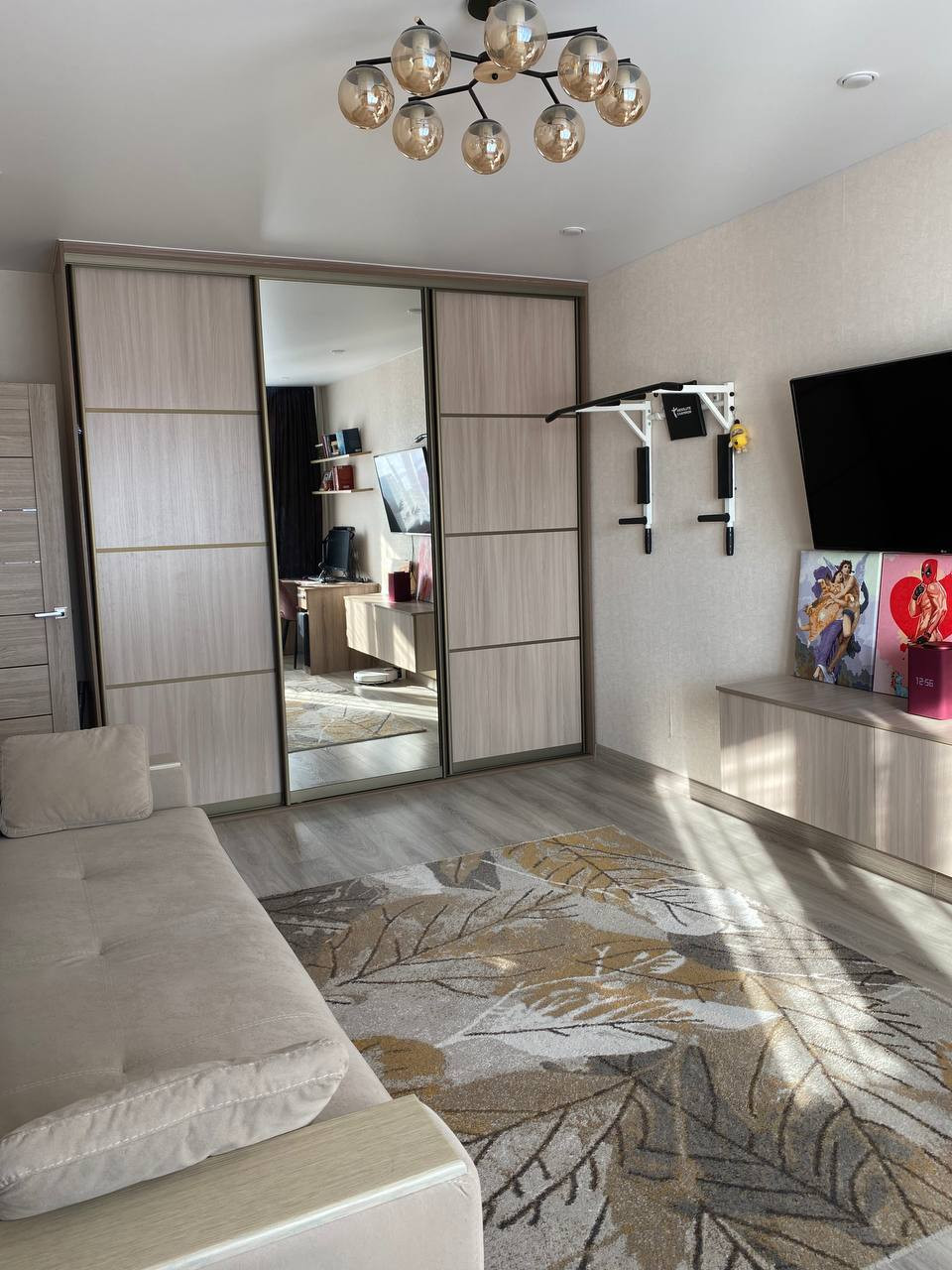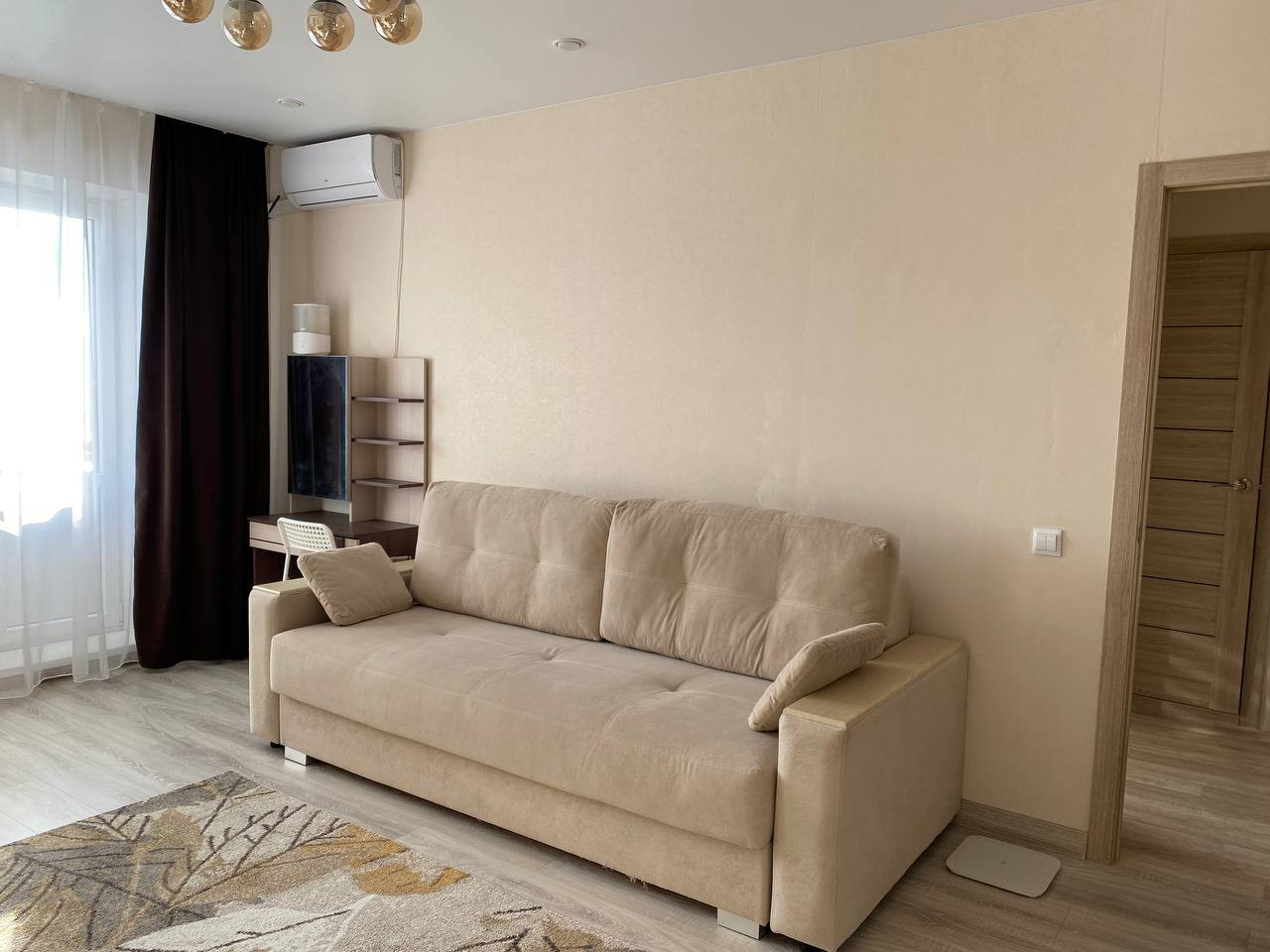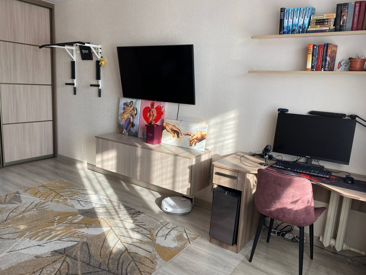 При продаже остается мебель: кухонный гарнитур, шкаф-купе, парящая тумба для ТВ, письменный (компьютерный) стол, полки для книг скрытого монтажа. Из техники: газовая плита, водонагреватель, кондиционер. Есть выводы под посудомоечную/стиральную машину на кухне и в кладовке.