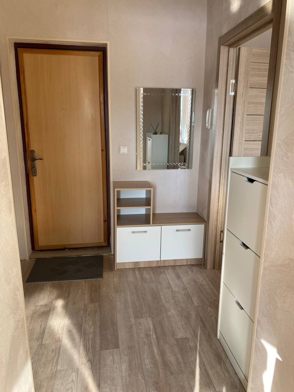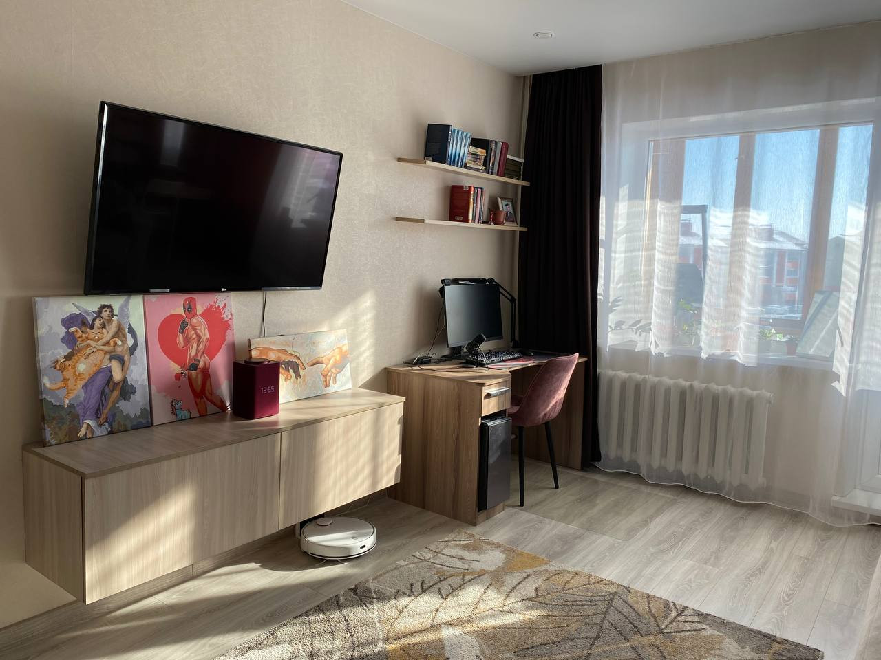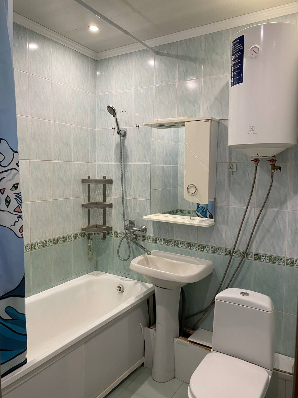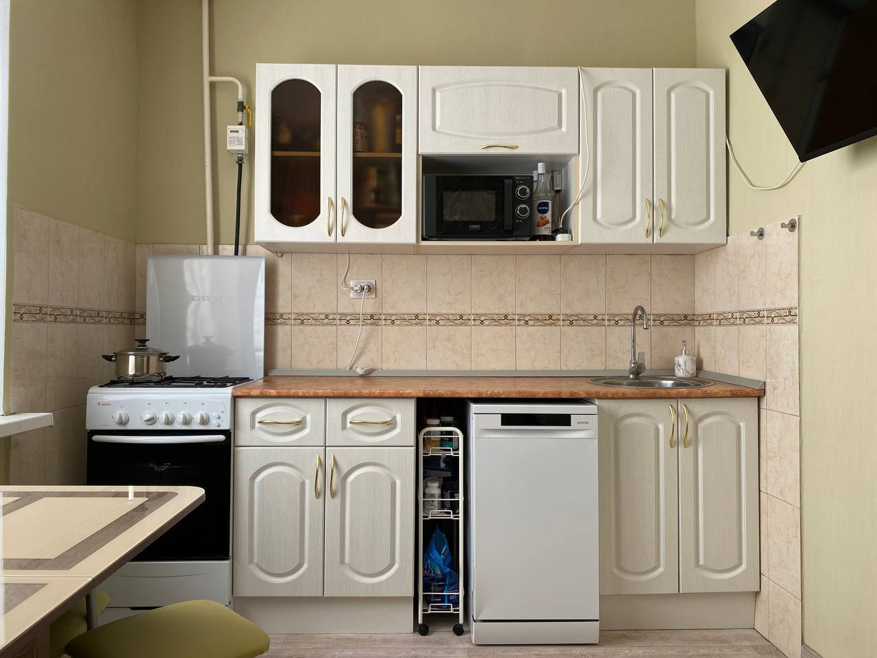При продаже остается мебель: кухонный гарнитур, шкаф-купе, парящая тумба для ТВ, письменный (компьютерный) стол, полки для книг скрытого монтажа. Из техники: газовая плита, водонагреватель, кондиционер. Есть выводы под посудомоечную/стиральную машину на кухне и в кладовке.