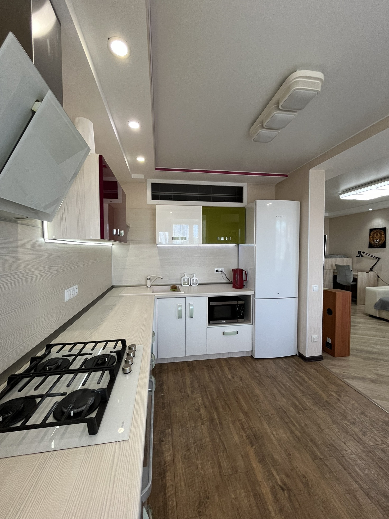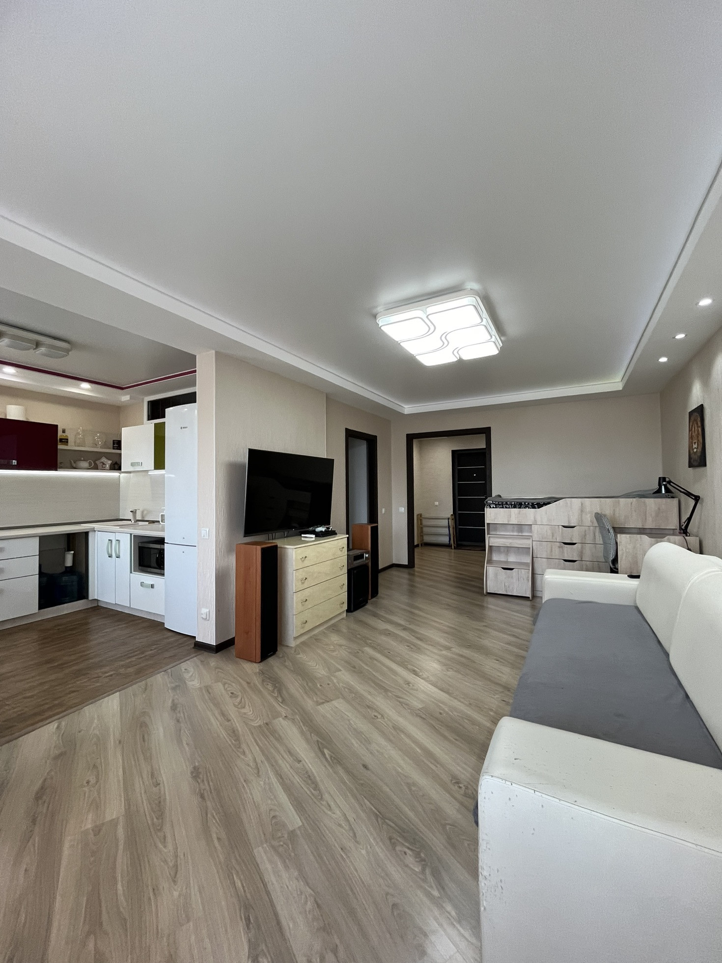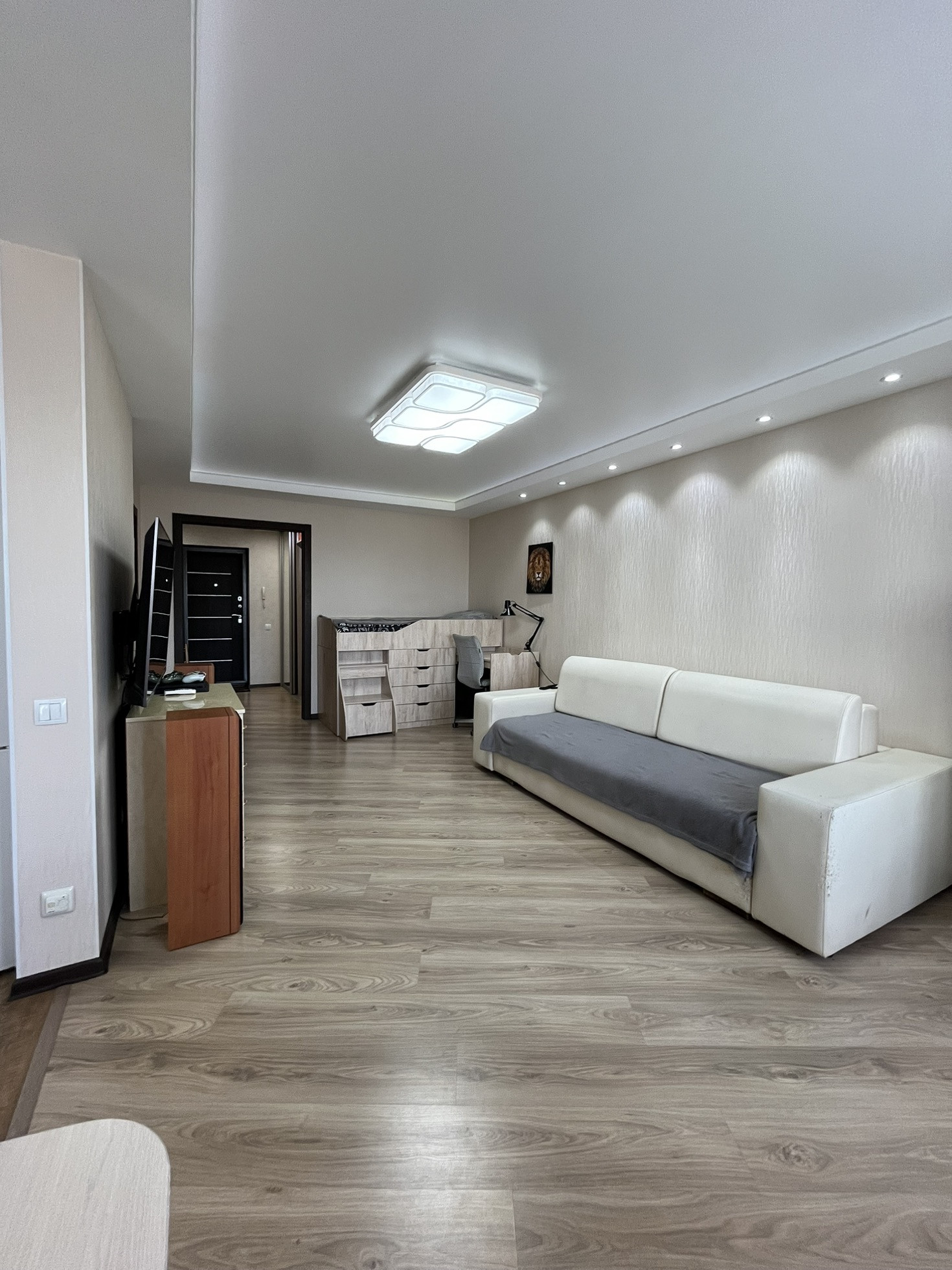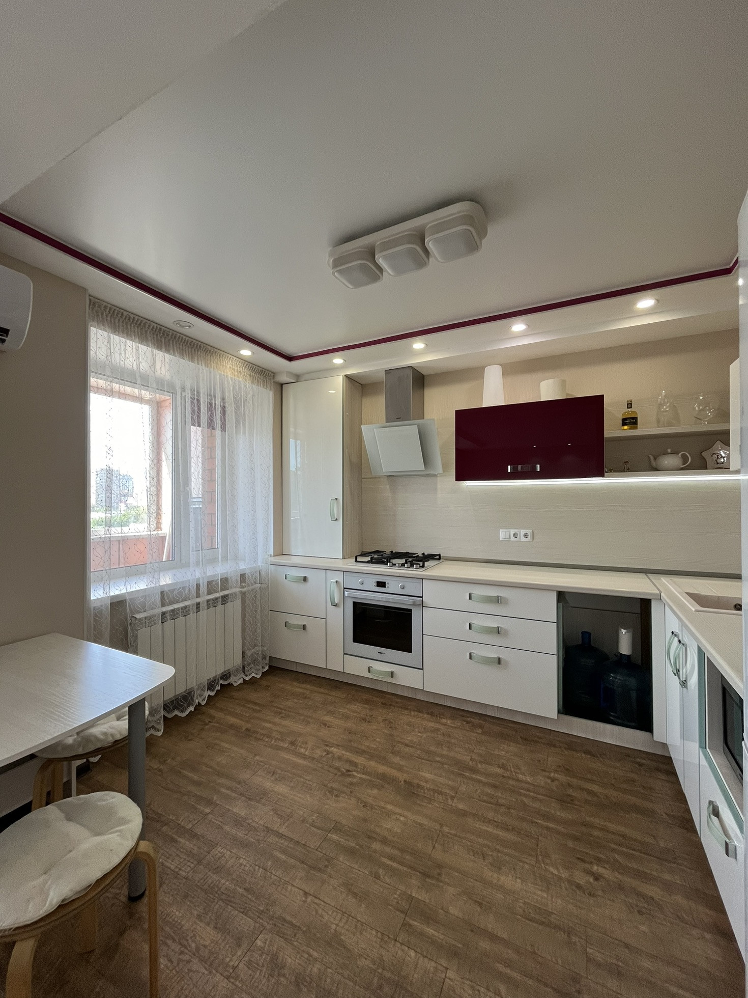 В квартире остаются кухня, газовая панель Gorenje, электрический духовой шкаф Beko, вытяжка, рабочая зона + шкаф в детской, гардеробная, кондиционер, водонагреватель.