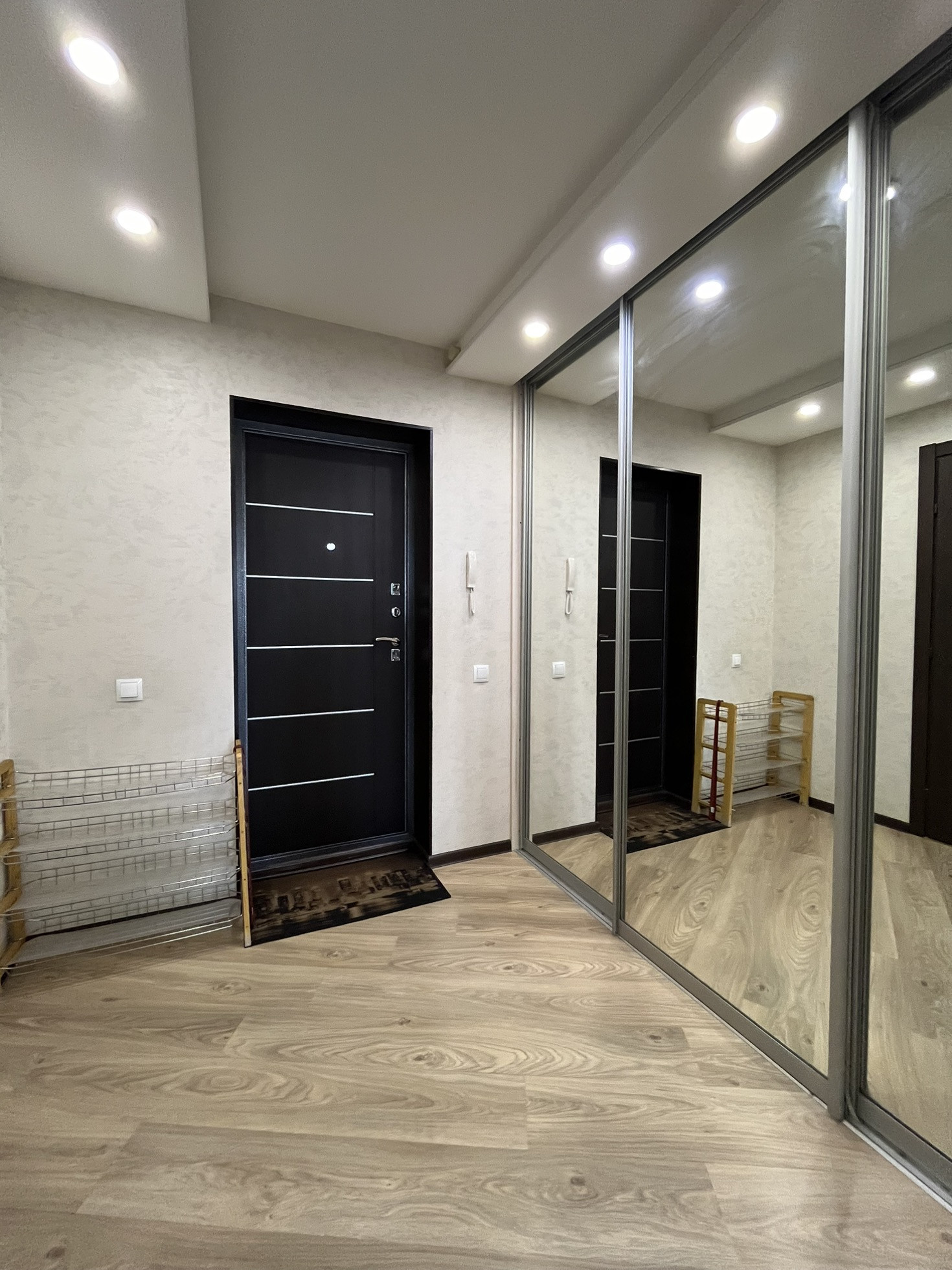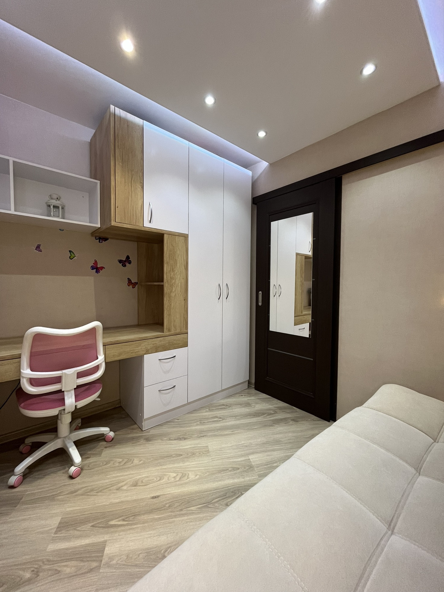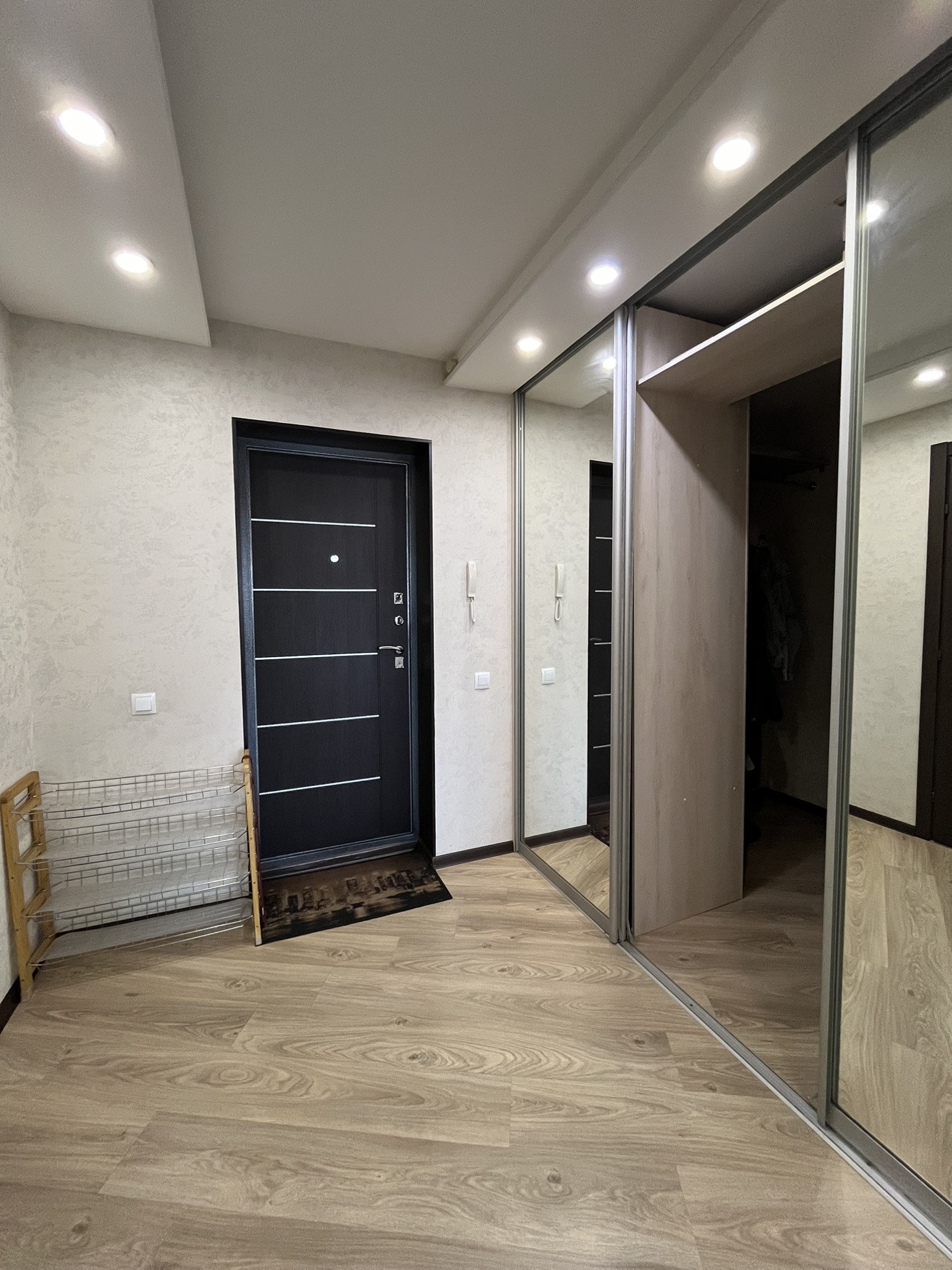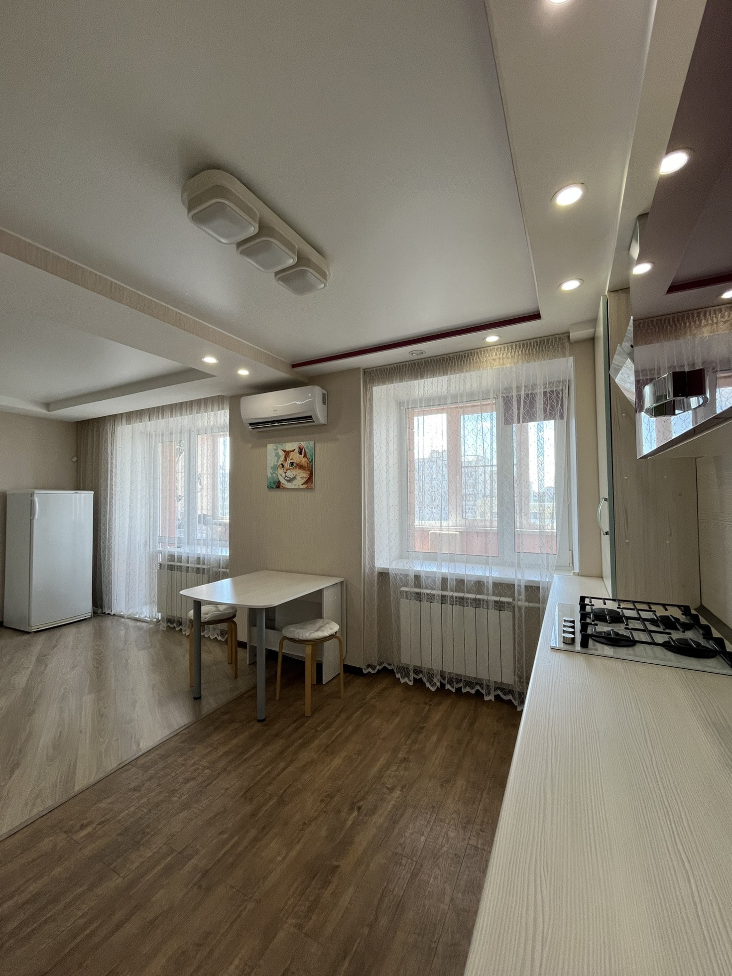 В квартире остаются кухня, газовая панель Gorenje, электрический духовой шкаф Beko, вытяжка, рабочая зона + шкаф в детской, гардеробная, кондиционер, водонагреватель.