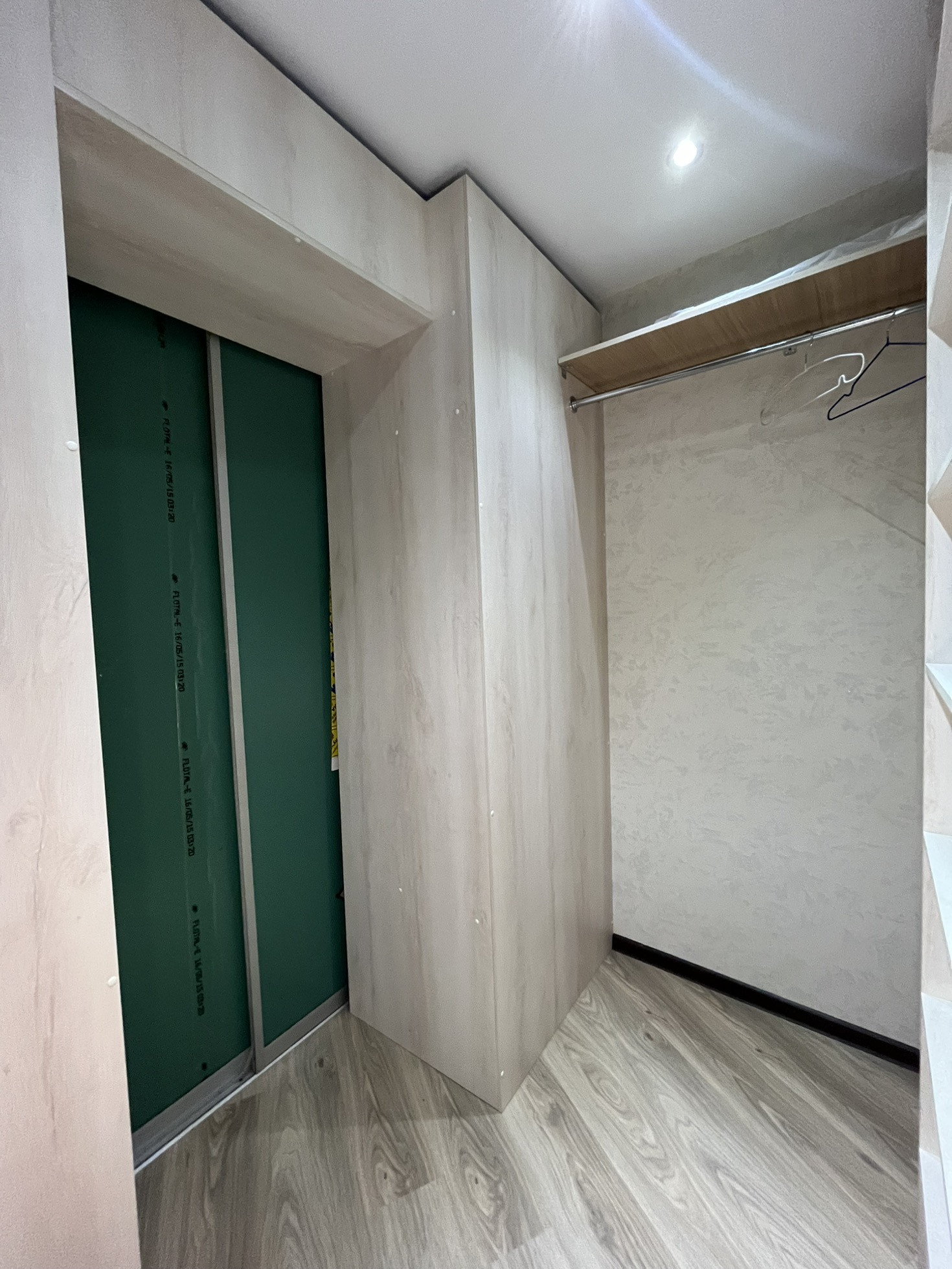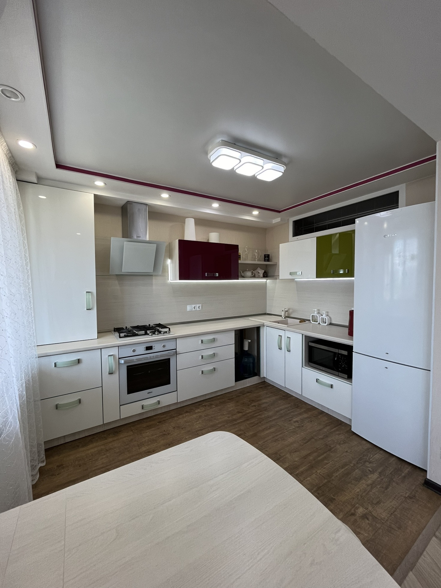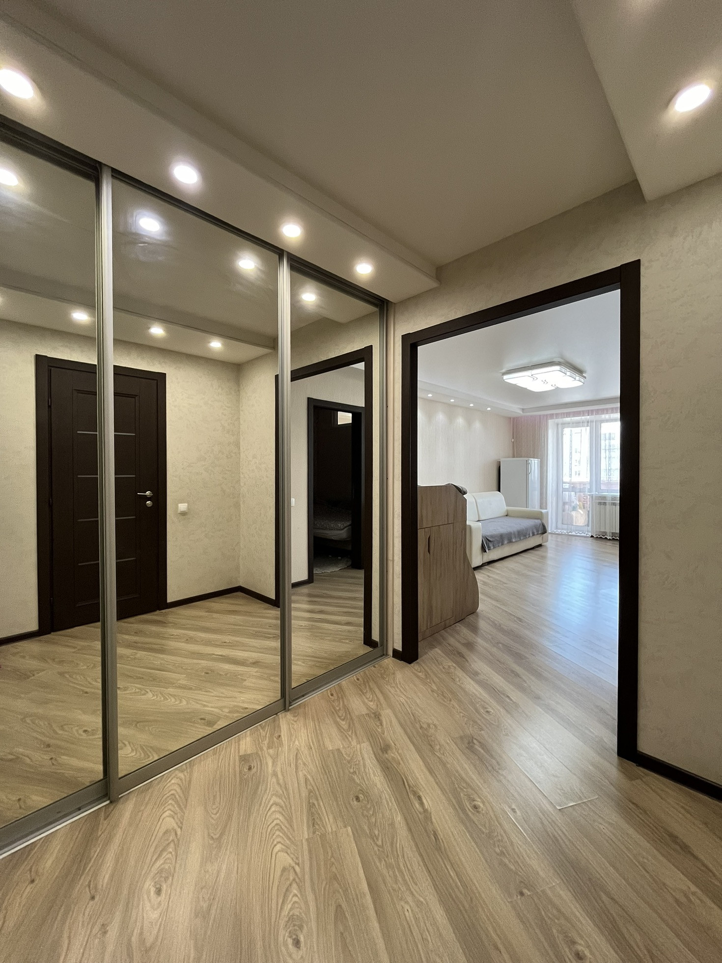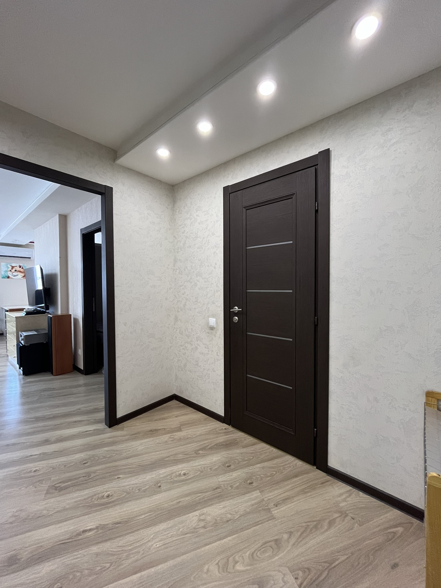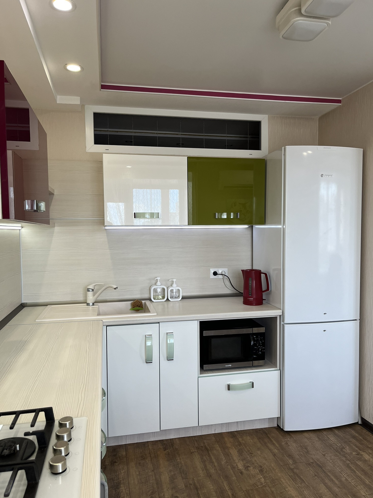 В квартире остаются кухня, газовая панель Gorenje, электрический духовой шкаф Beko, вытяжка, рабочая зона + шкаф в детской, гардеробная, кондиционер, водонагреватель.