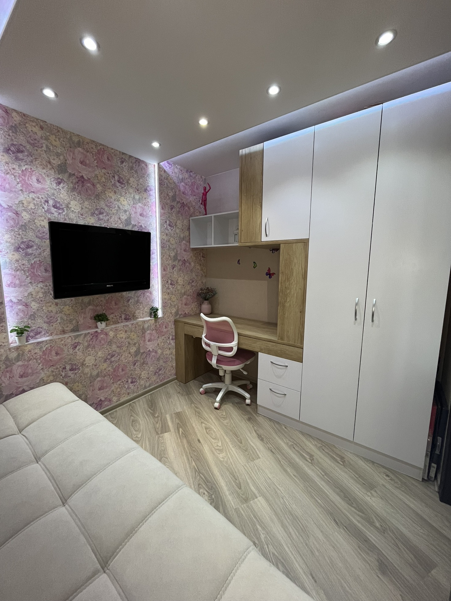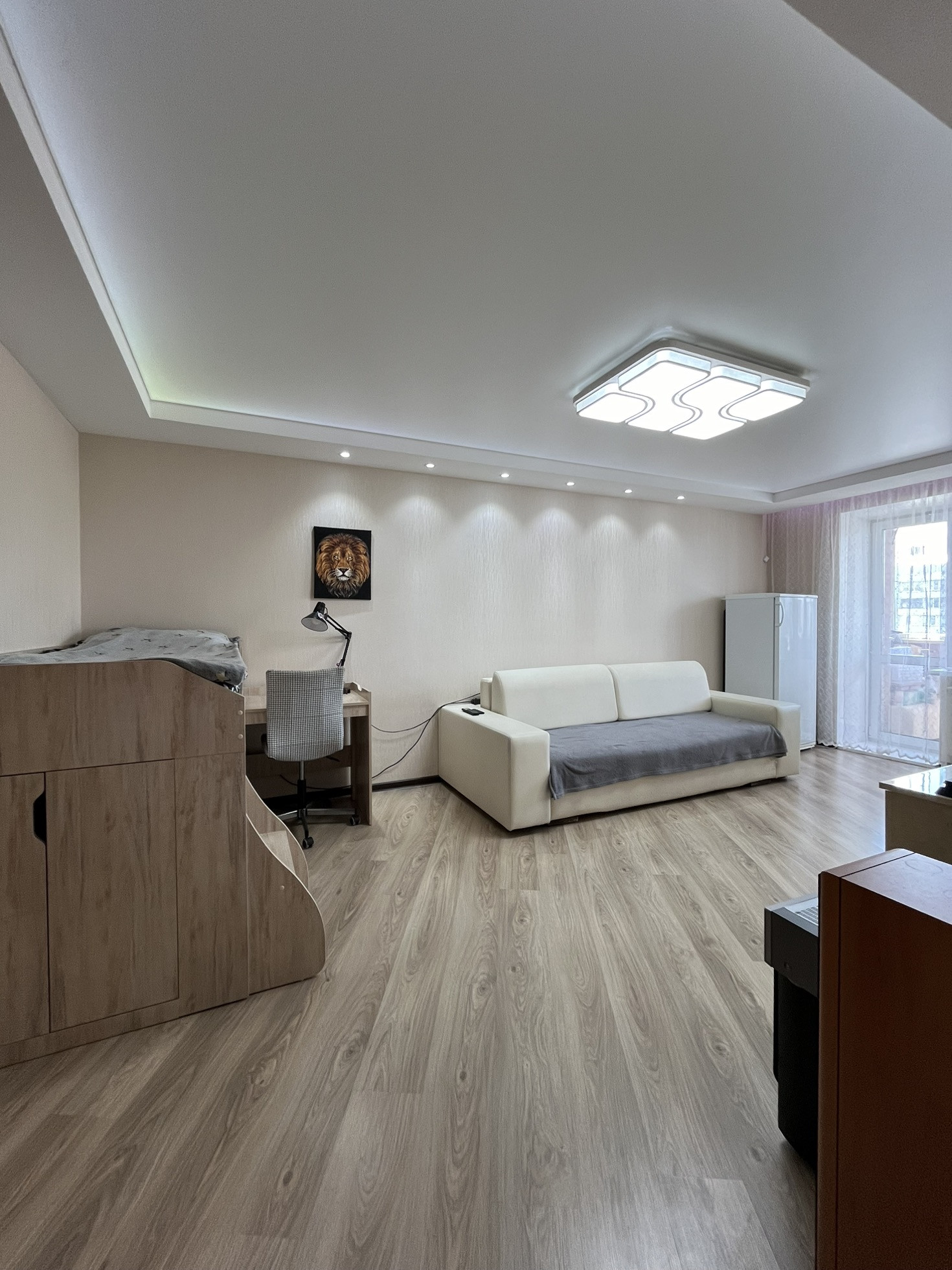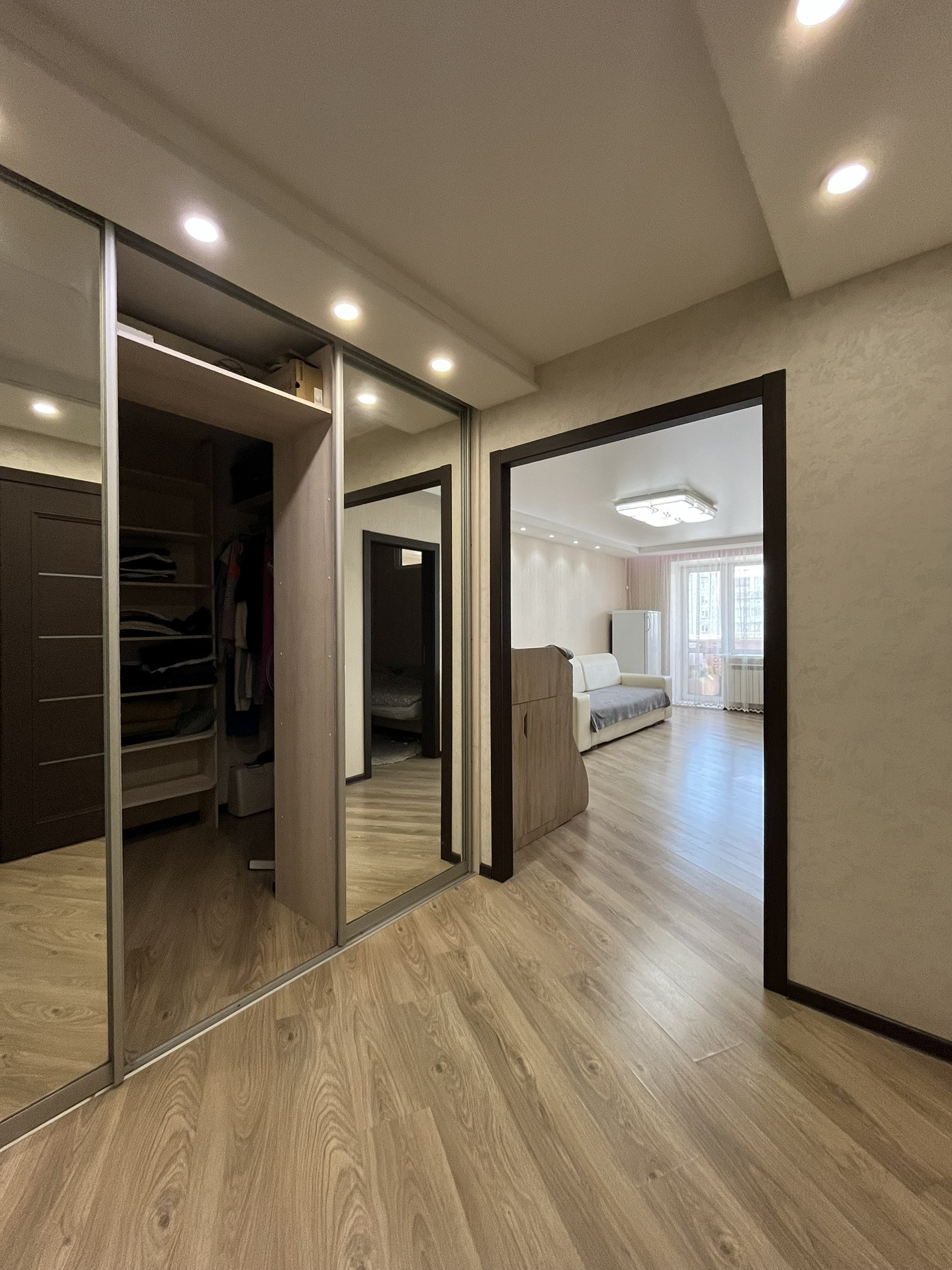 По проекту это однокомнатная квартира, но сделана перепланировка. Теперь в квартире большая кухня-гостиная и отдельная спальня или детская. Санузел совмещён. Имеется также большая гардеробная комната, поэтому все вопросы с хранением вещей решены. Также есть большая 6 метровая лоджия.