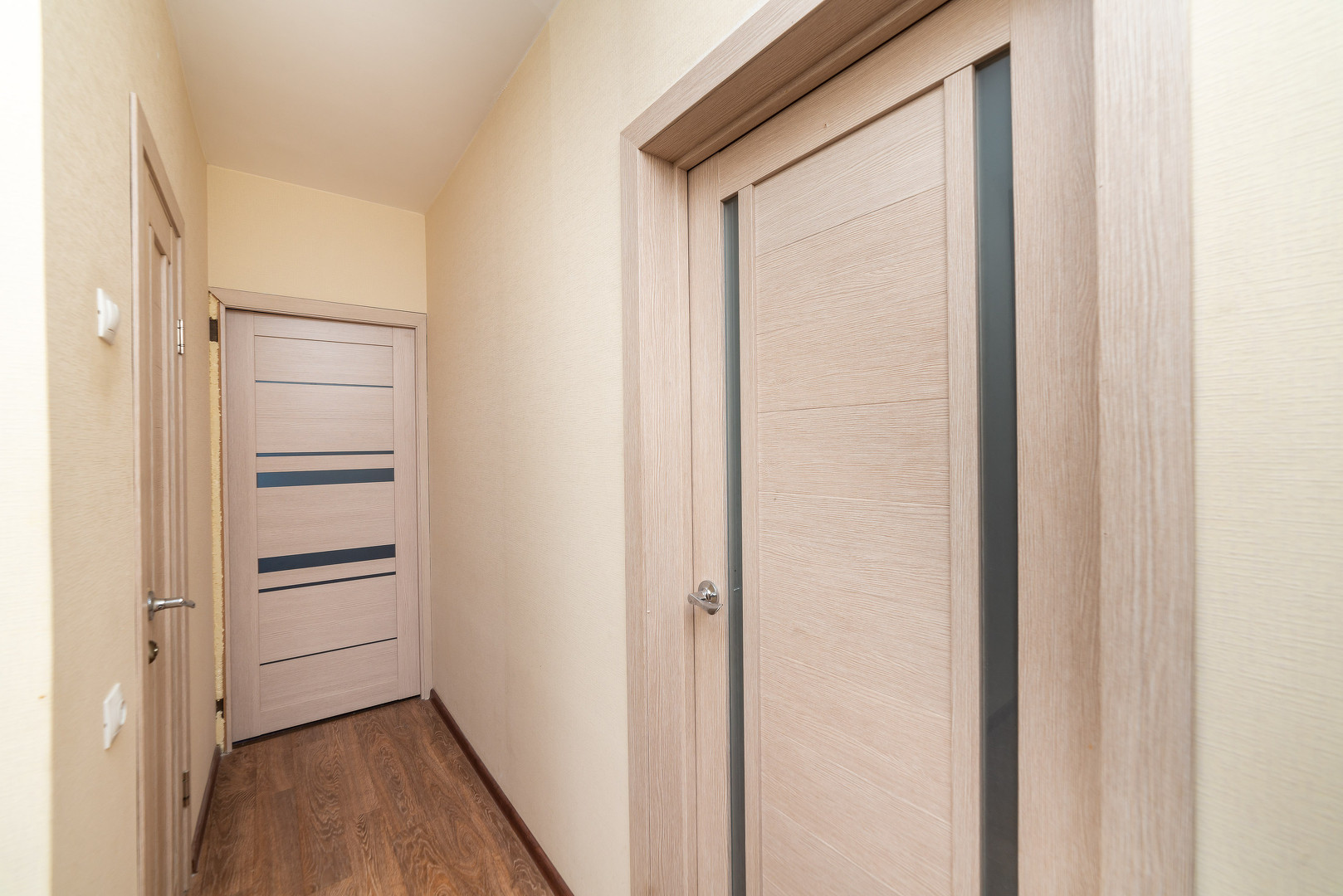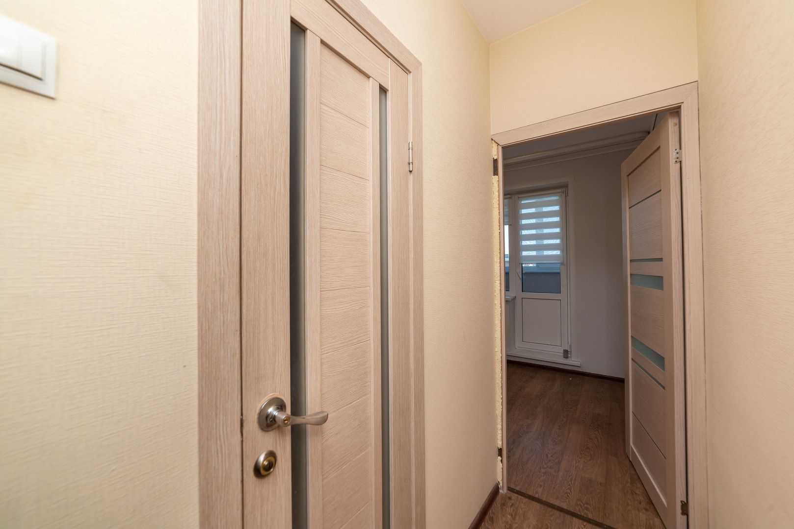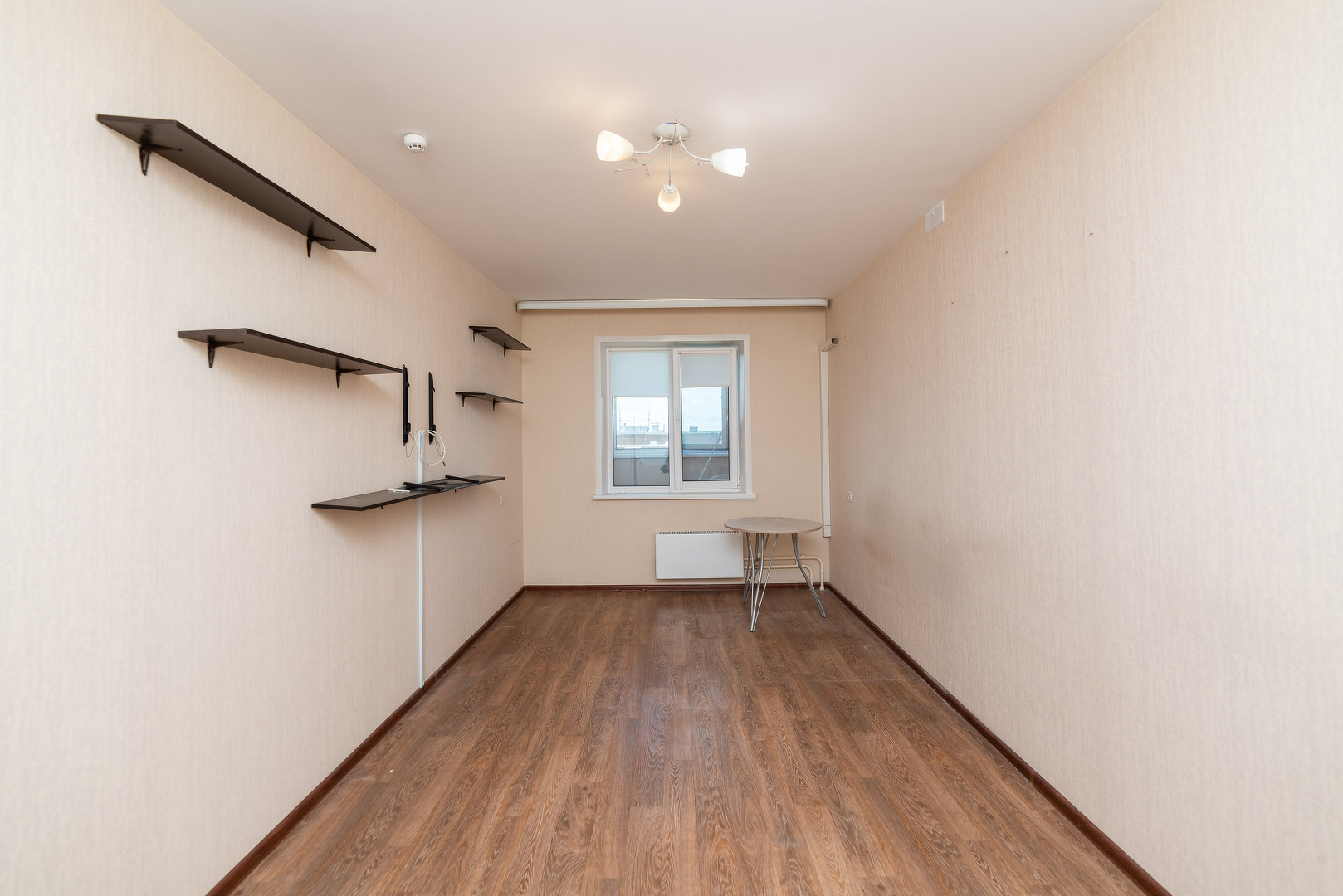 Обои в теплых и светлых тонах. На полу линолеум отличного качества.