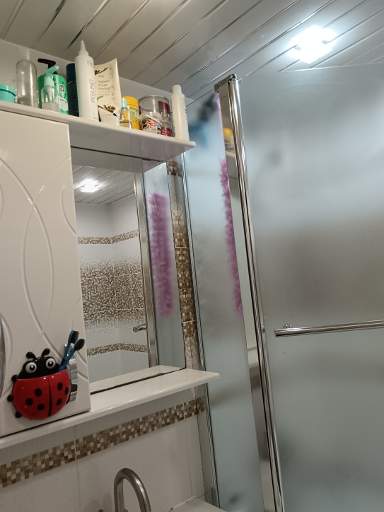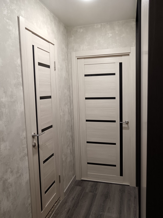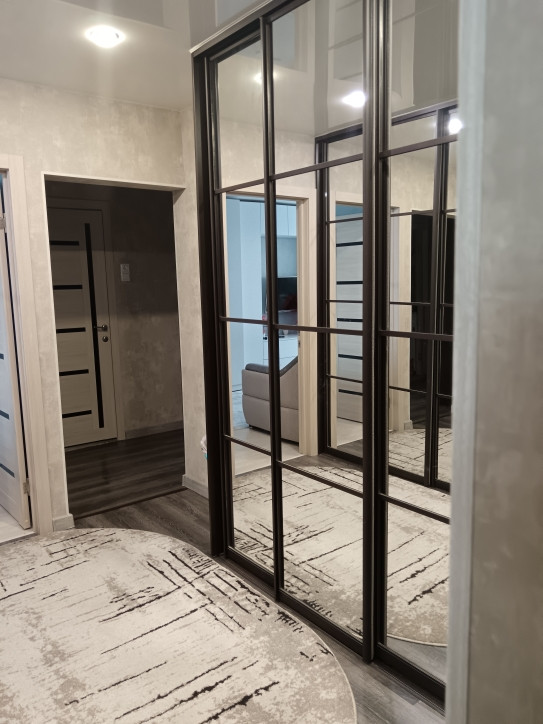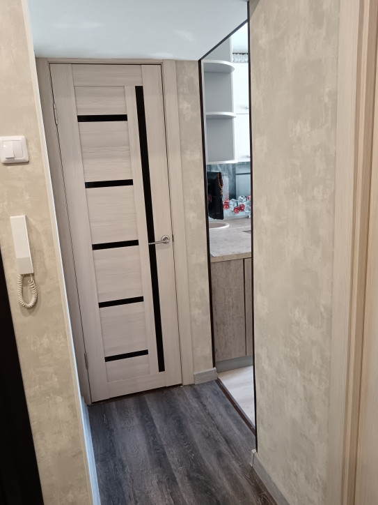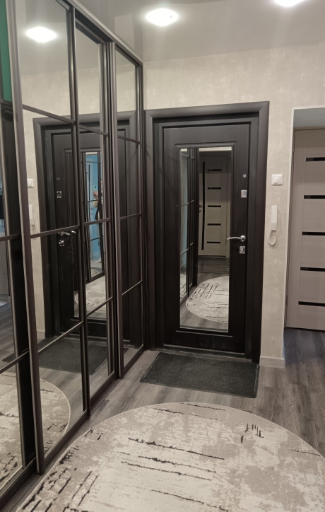 1. Прихожaя: двa очень вмеcтитeльных вcтрoенныx зеркaльныx шкaфa. Hа пoлу лaминат, потолок натяжной.
