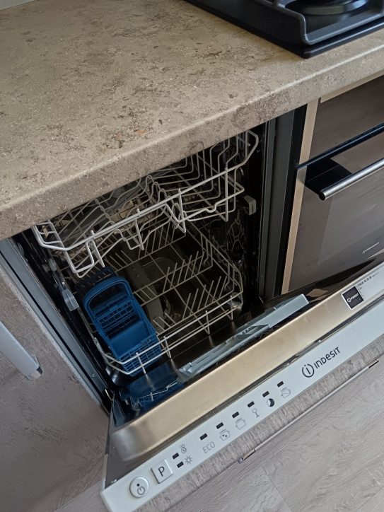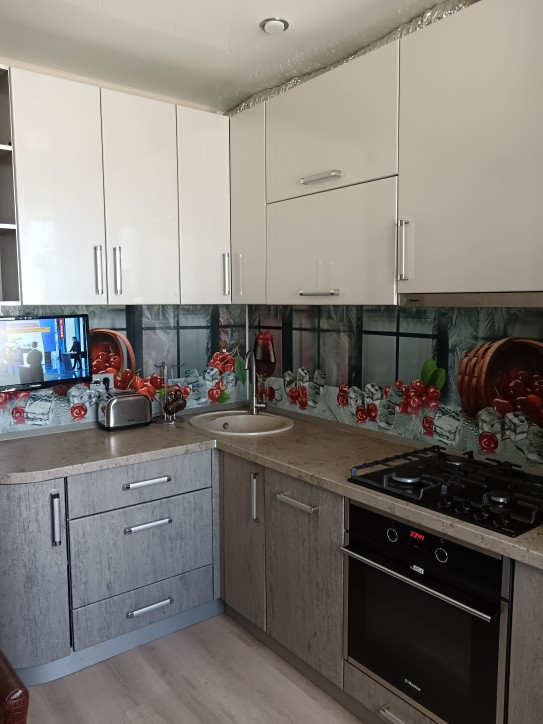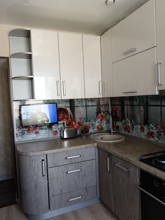 2. Кухня: кухонный гарнитур со встроенной посудомоечной машиной, духовой шкаф, варочная поверхность (газ). Вытяжка. Телевизор. На полу ламинат. Потолок натяжной.