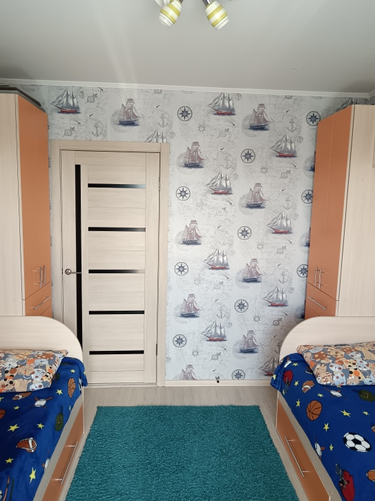 6. Комната с выходом на лоджию: для двух детей. У каждого своё место, своя мебель (кровать, шкаф, рабочее место). На полу ламинат.