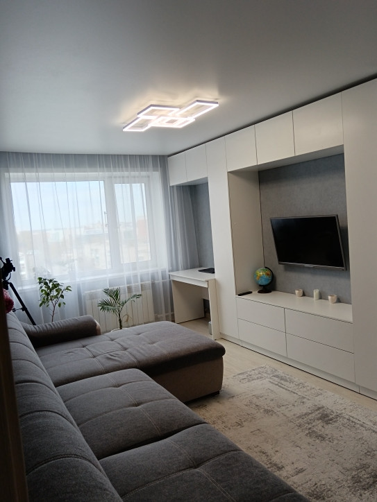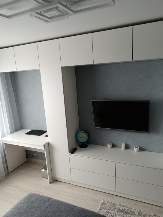 4. Зал: встроенный шкаф во всю стену, с местом под телевизор, комодом, рабочим местом, антресолью. На полу ламинат, потолок натяжной.