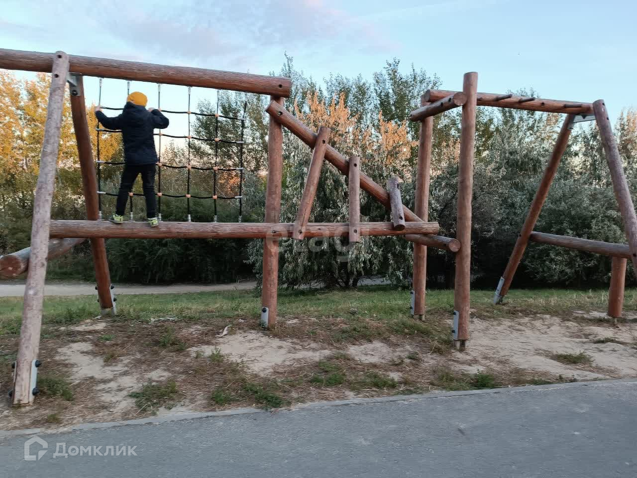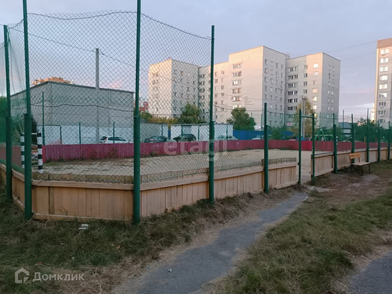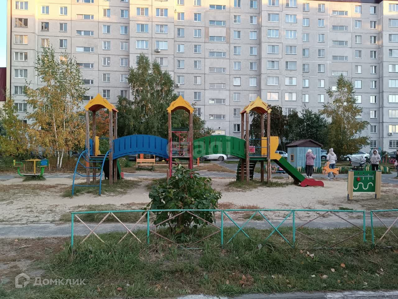 Во дворе детская площадка, парковка для автомобилей.
