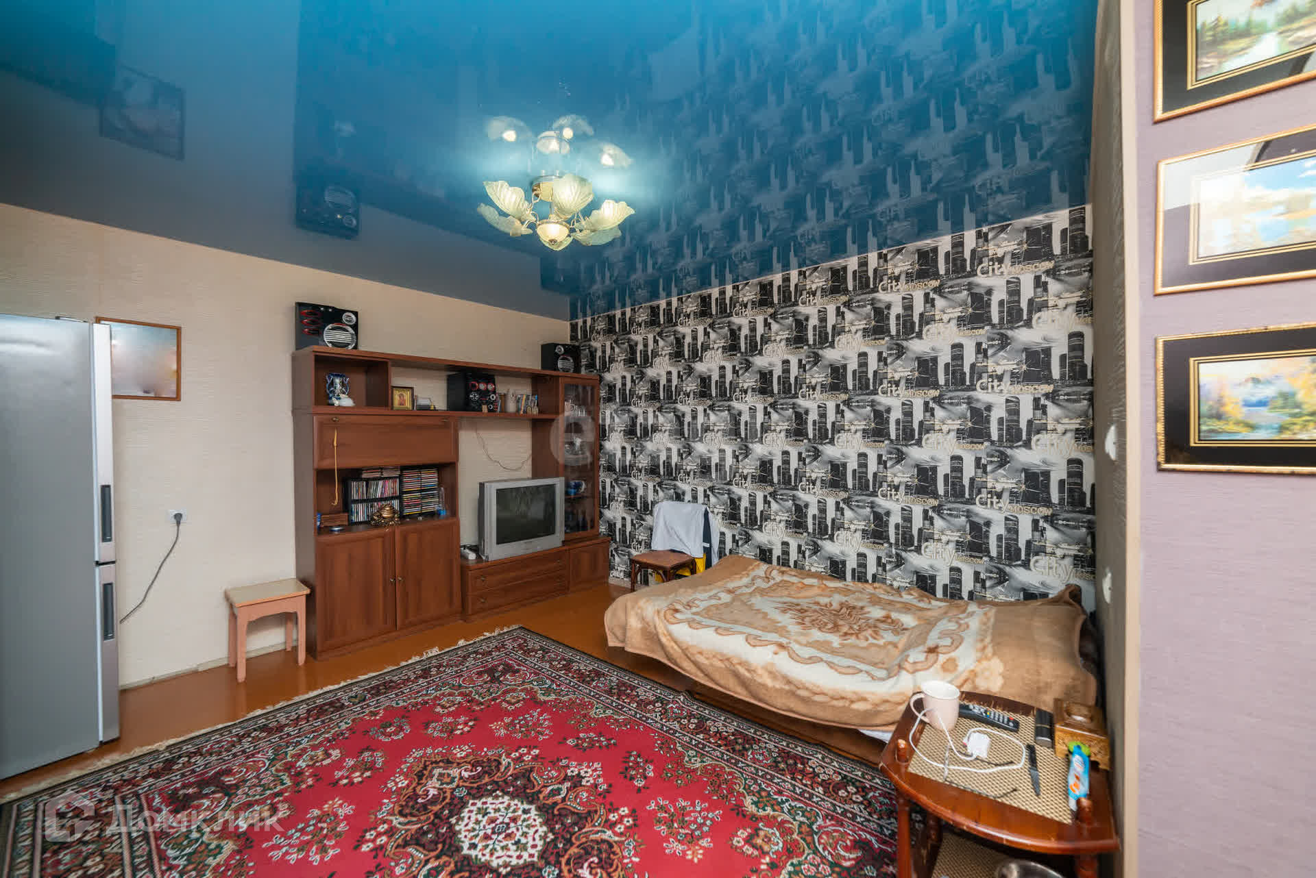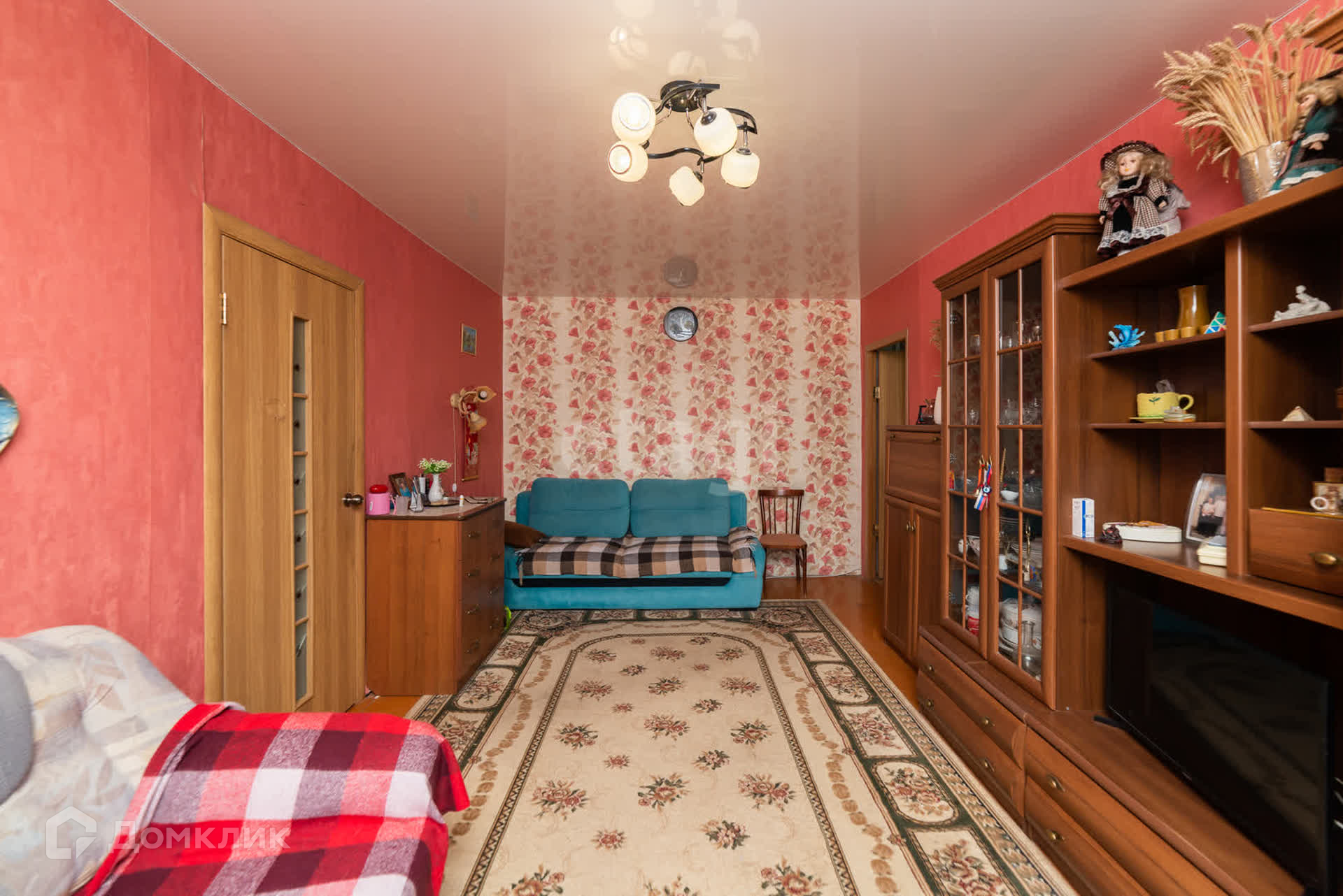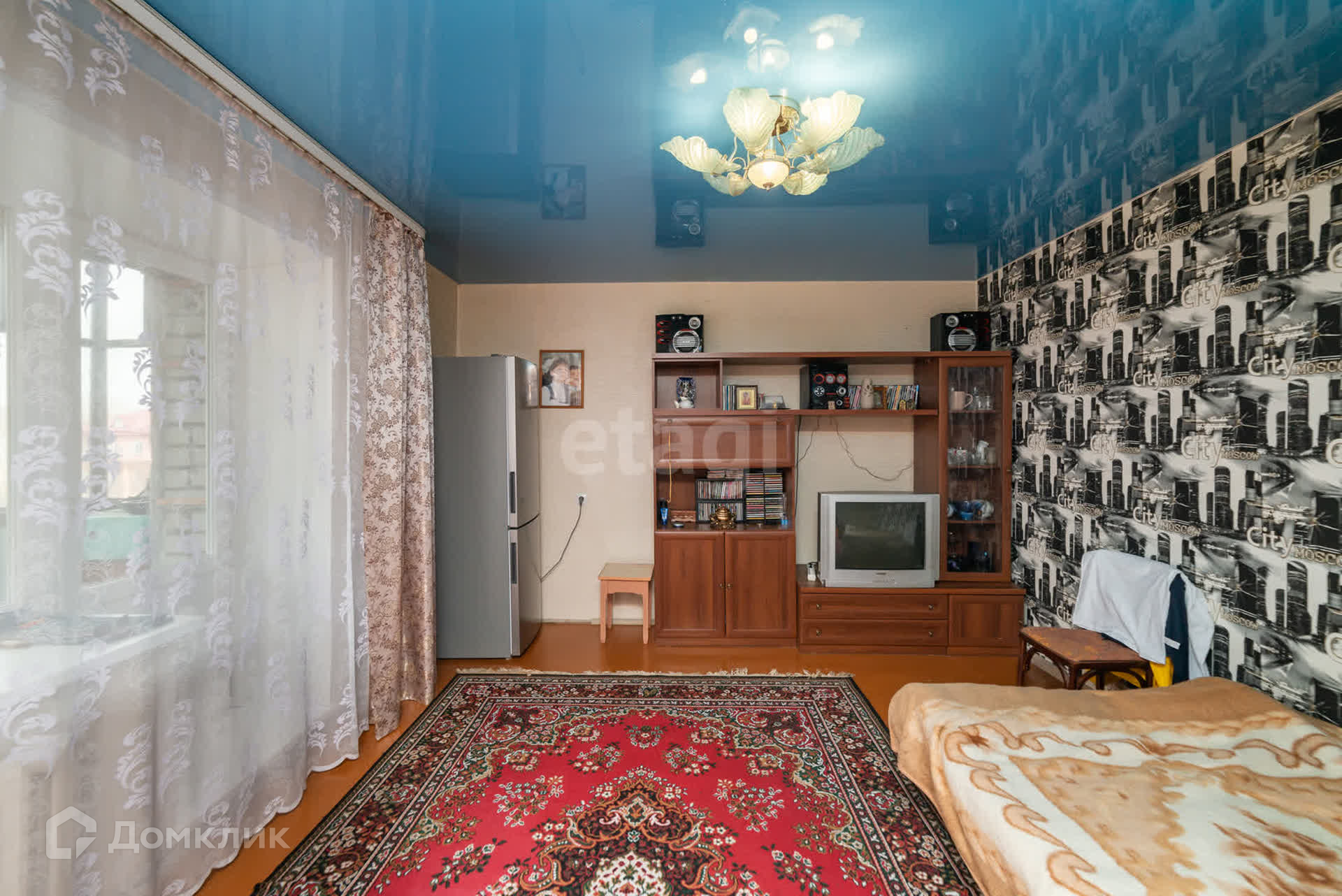 Квартира с аккуратным косметическим ремонтом: на стенах обои, потолки натяжные, пол - линолеум.