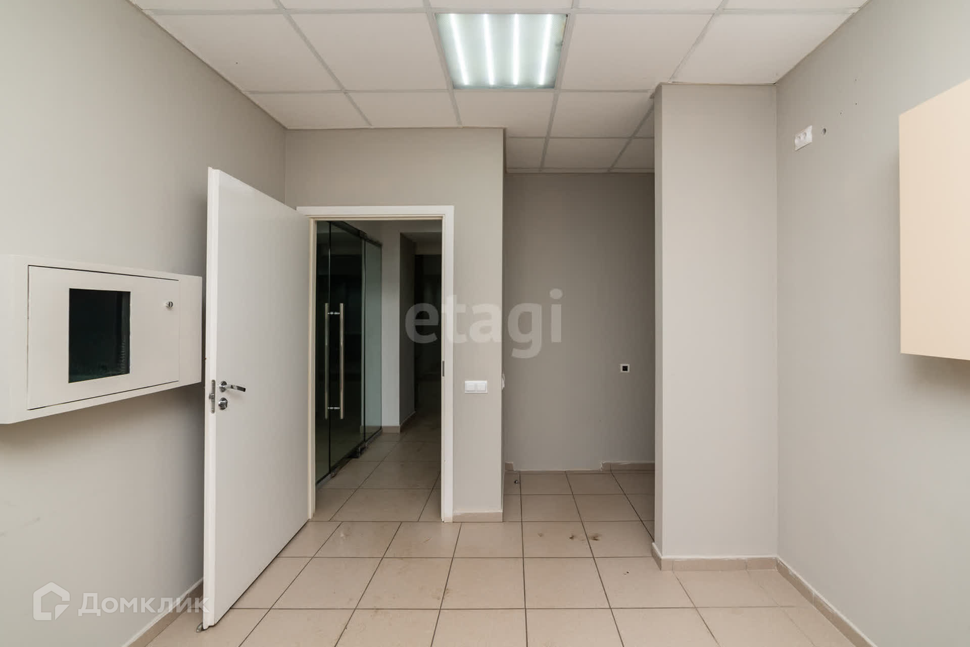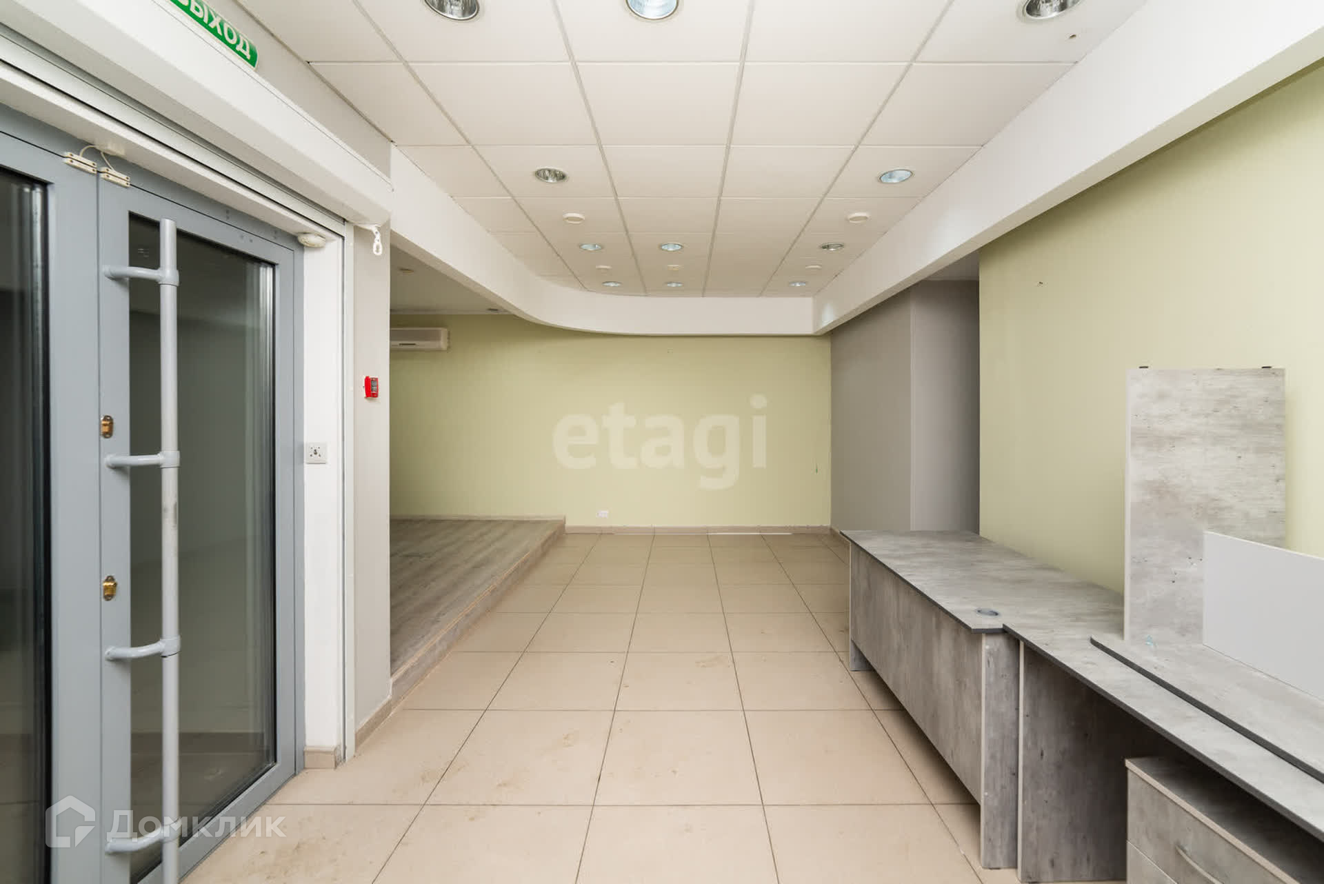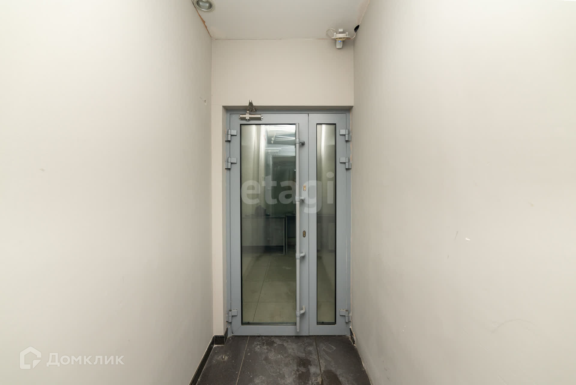 Вход в помещение через просторный тамбур с двумя стеклянными дверями, каждая из которых оборудована тепловой завесой и металлическими рольставнями с электроприводом.