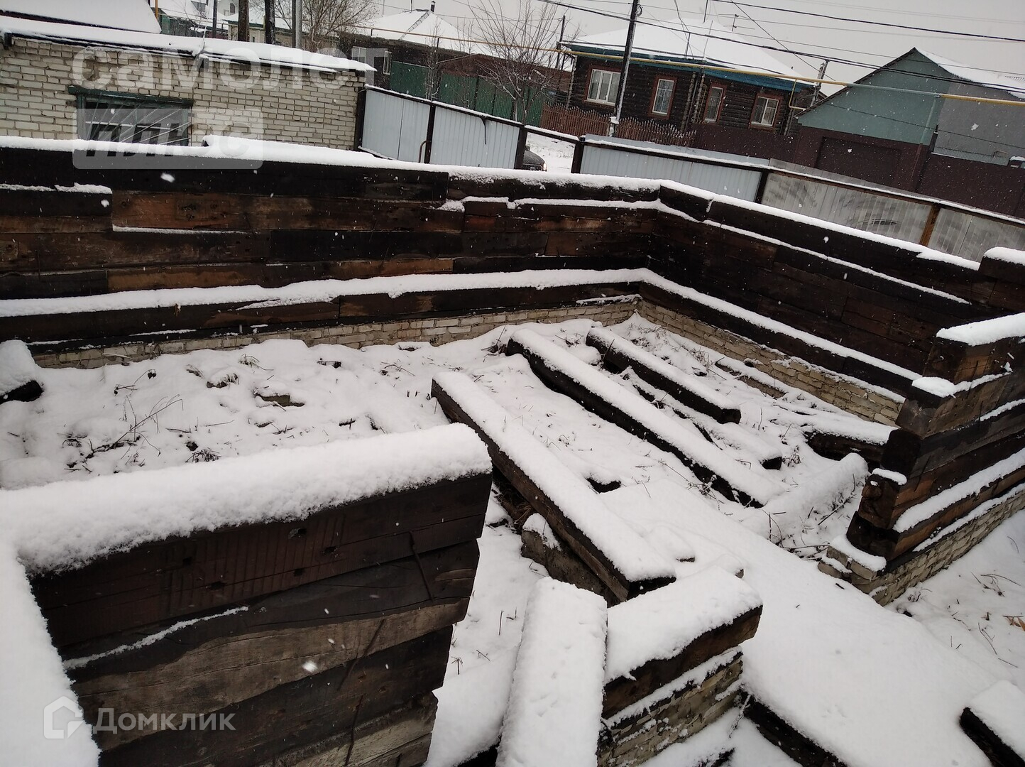 На участке есть кирпичный гараж, заложен фундамент под строительство дома и выложено несколько рядов шпал до окон.