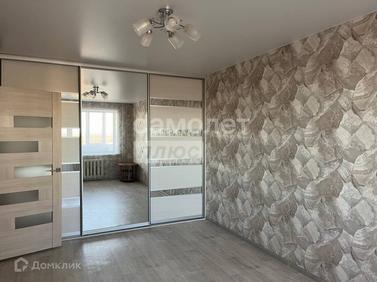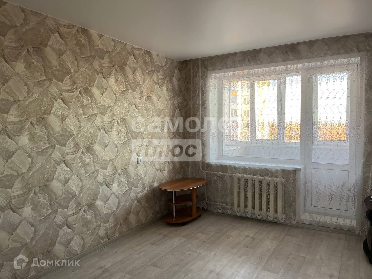 Лоджия  застеклена, в комнате  натяжной потолок, пол - линолеум, стены - обои, из мебели  - встроенный функциональный шкаф - гардероб.