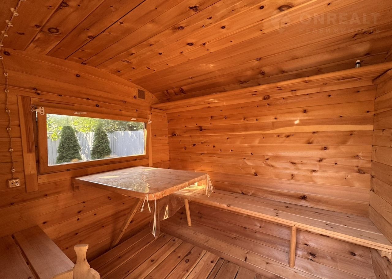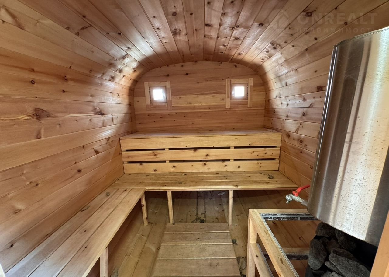Баня на дровах, сделана из кедра. Гараж просторный, с высоким потолком и ямой, есть большое подвальное помещение.