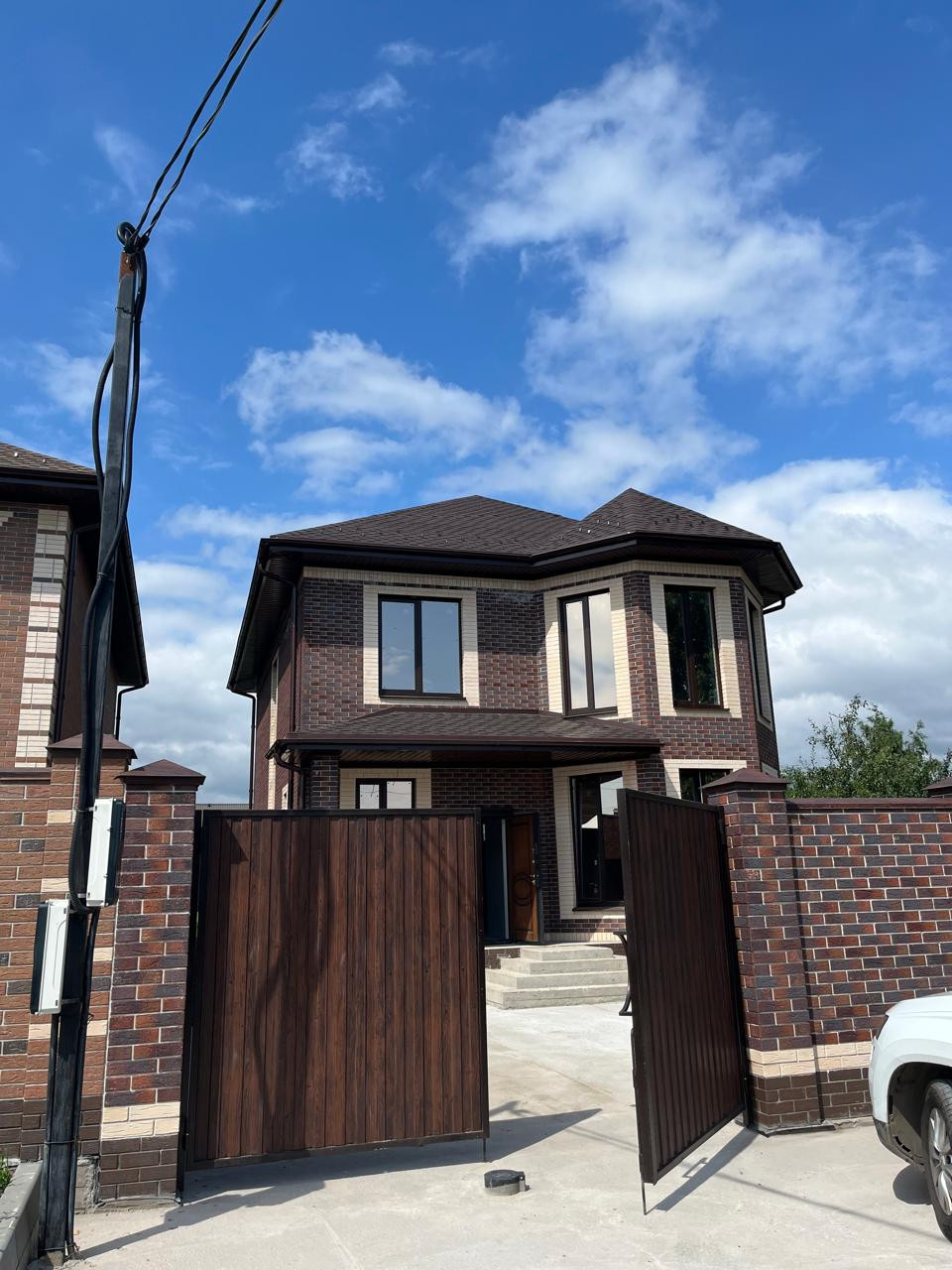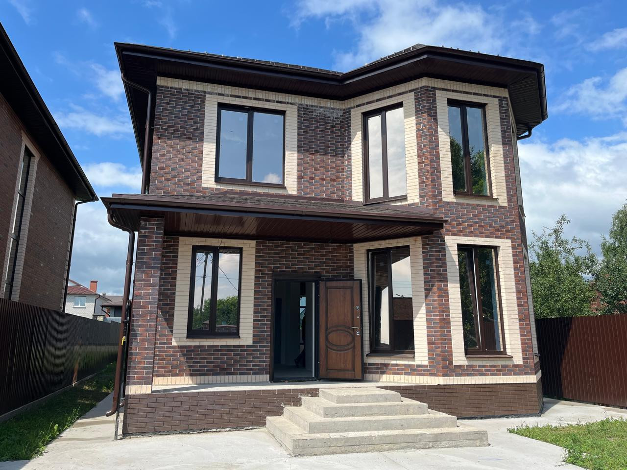 Продается новый двухэтажный дом 177,5 кв.м. на земельном участке 5 соток. Материал стен пеноблок, облицовочный керамический кирпич, фундамент ленточный. Мягкая кровля, утеплитель 150мм, водосточная система. Выполнена отмостка вокруг дома, бетонные: площадка под парковку, дорожка от крыльца до калитки. По периметру участка установлен забор из профлиста. По фасаду: кирпичные колонны, профлист, ворота откатные, калитка.  Все коммуникации подведены (газ, электричество, водоснабжение). Выполнена чистовая отделка стен (гипсовая штукатурка), механизированная стяжка пола, теплые полы на 1 этаже.  Установлен газовый двухконтурный котел.