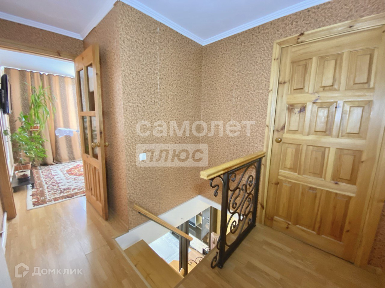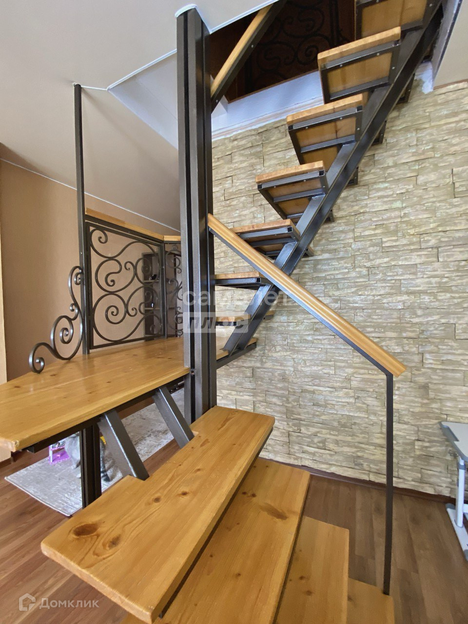 На второй этаж ведет кованная деревянная лестница.
