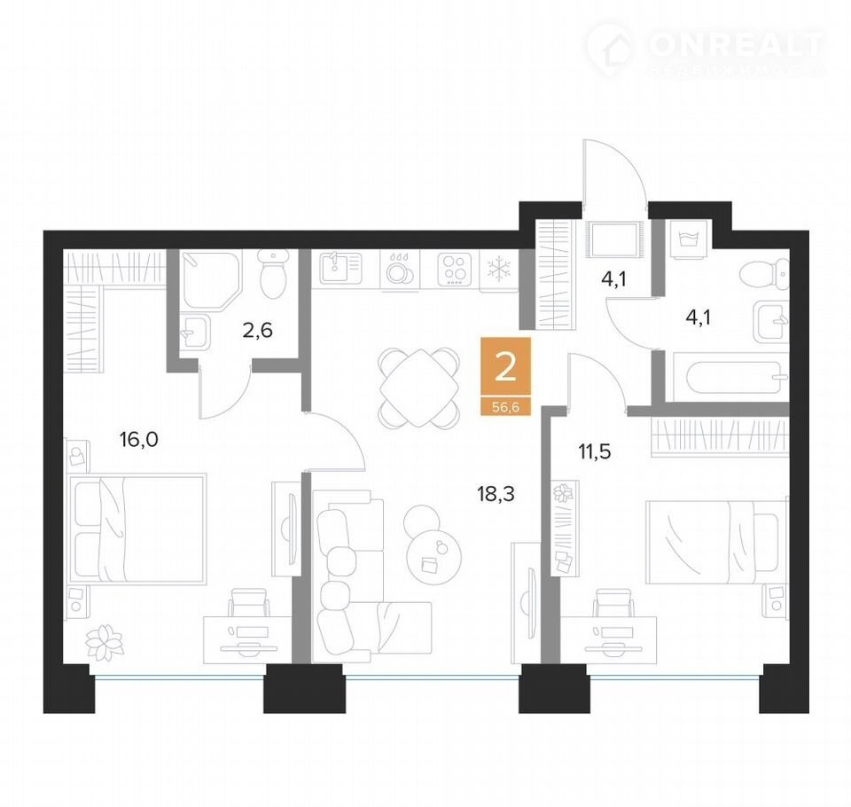 Общая площадь 56.6 м2