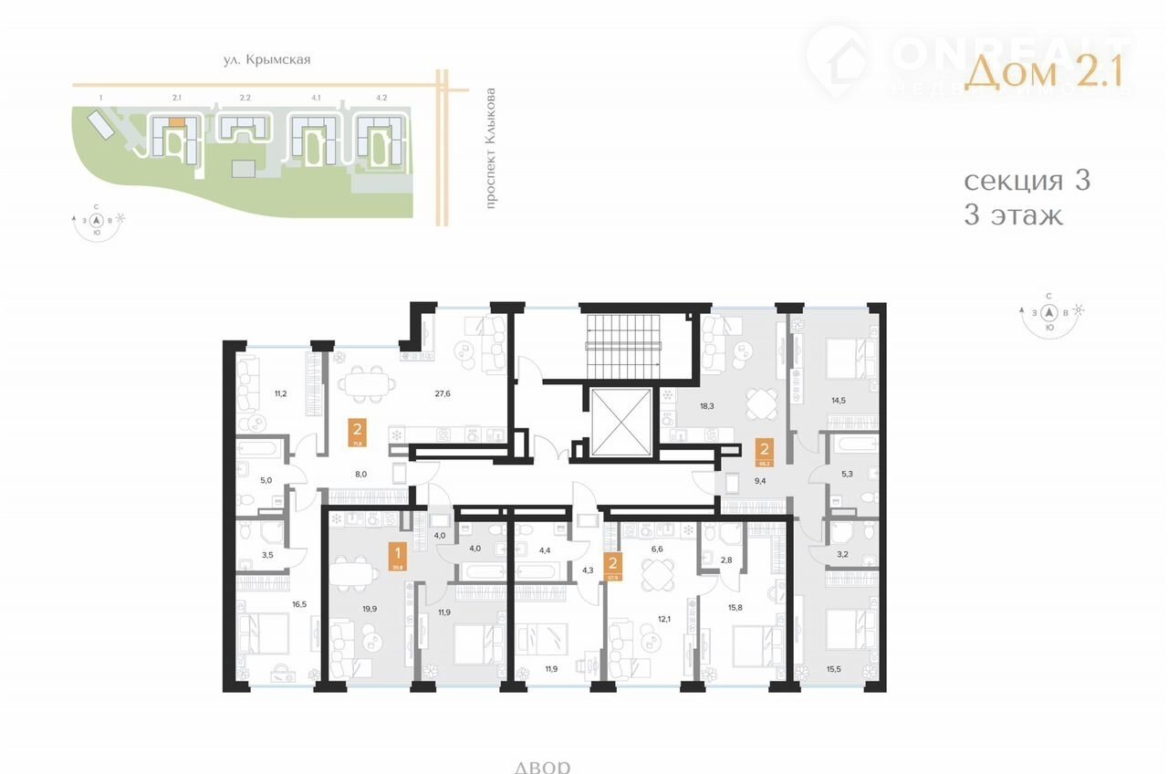 2-комнатная квартира, 57.9 м2, этаж 3 / 16, на продажу в Курске