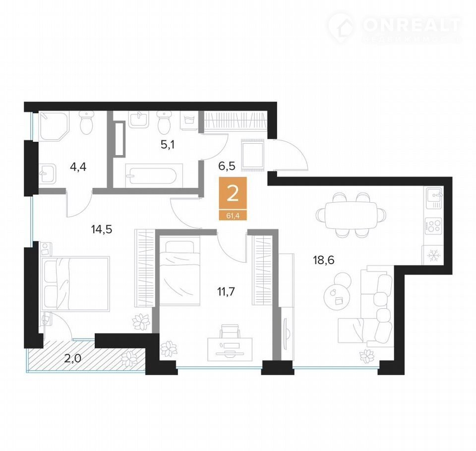 Общая площадь 61.4 м2