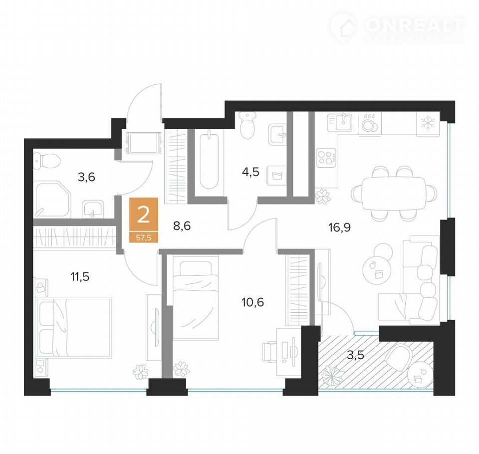 Общая площадь 57.5 м2