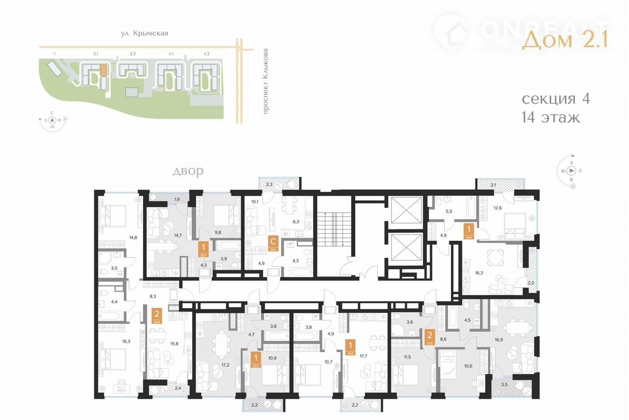 2-комнатная квартира, 57.5 м2, этаж 14 / 16, на продажу в Курске