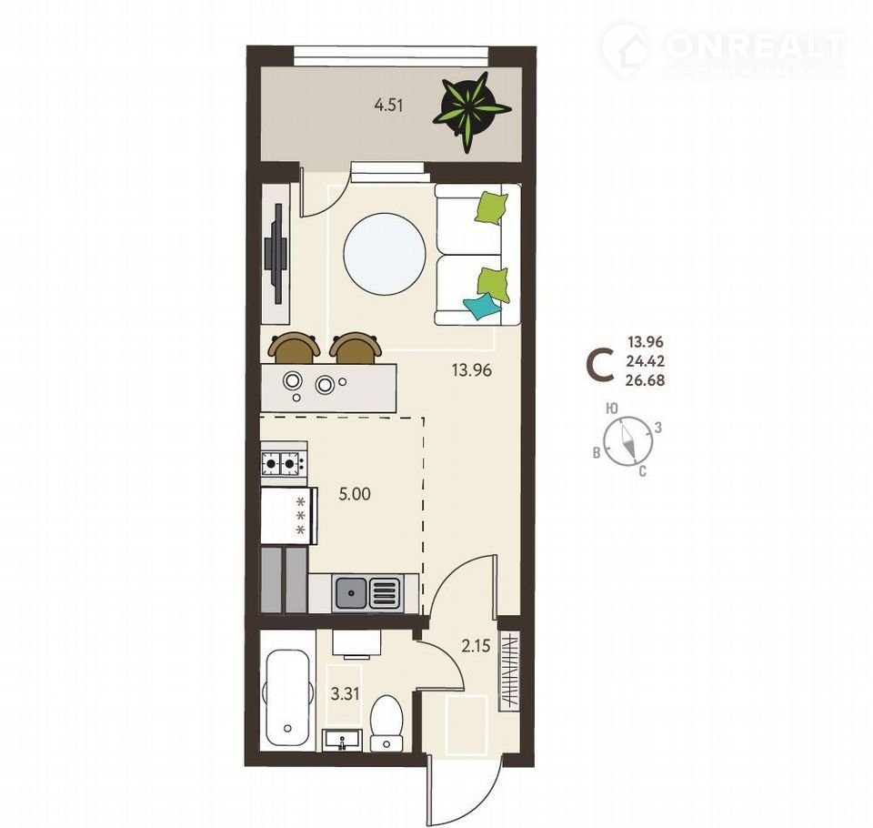Общая площадь 26.7 м2