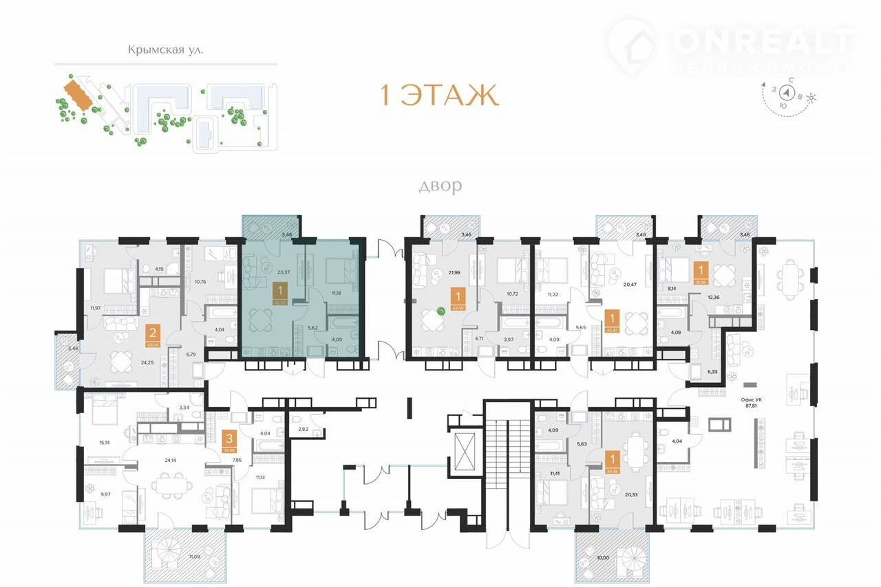 1-комнатная квартира, 42.3 м2, этаж 8 / 9, на продажу в Курске