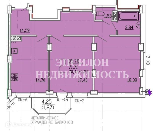 Квартира не угловая. Улучшенная планировка на одну сторону: просторные комнаты 18,4+17,4 кв.м., кухня почти 15 кв.м., раздельный с/у, большой коридор, балкон около 5 метров.