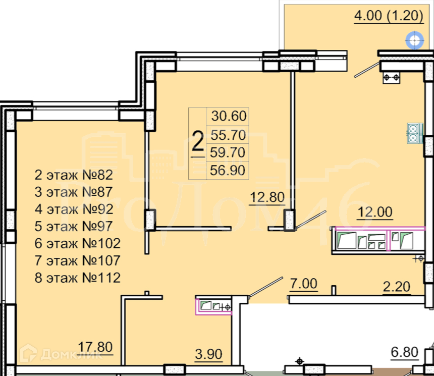 2-комнатная квартира, 59.7 м2, этаж 4 / 8, на продажу в Курске, улица Генерала Григорова, 44