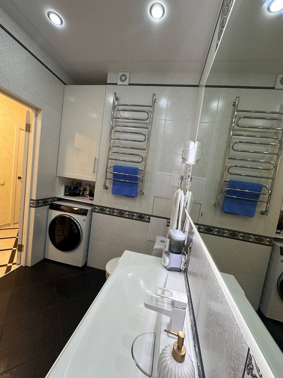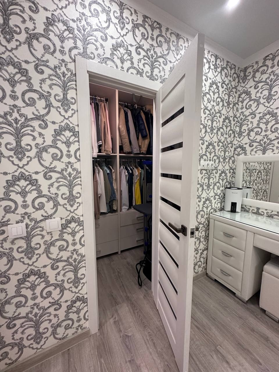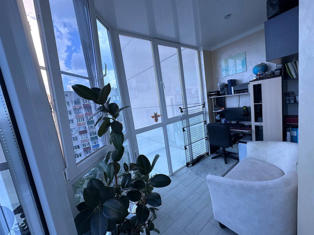 3 комнаты, санузел, кухня, гардеробная, кладовая, сушильная комната, лоджия сделана как кабинет.