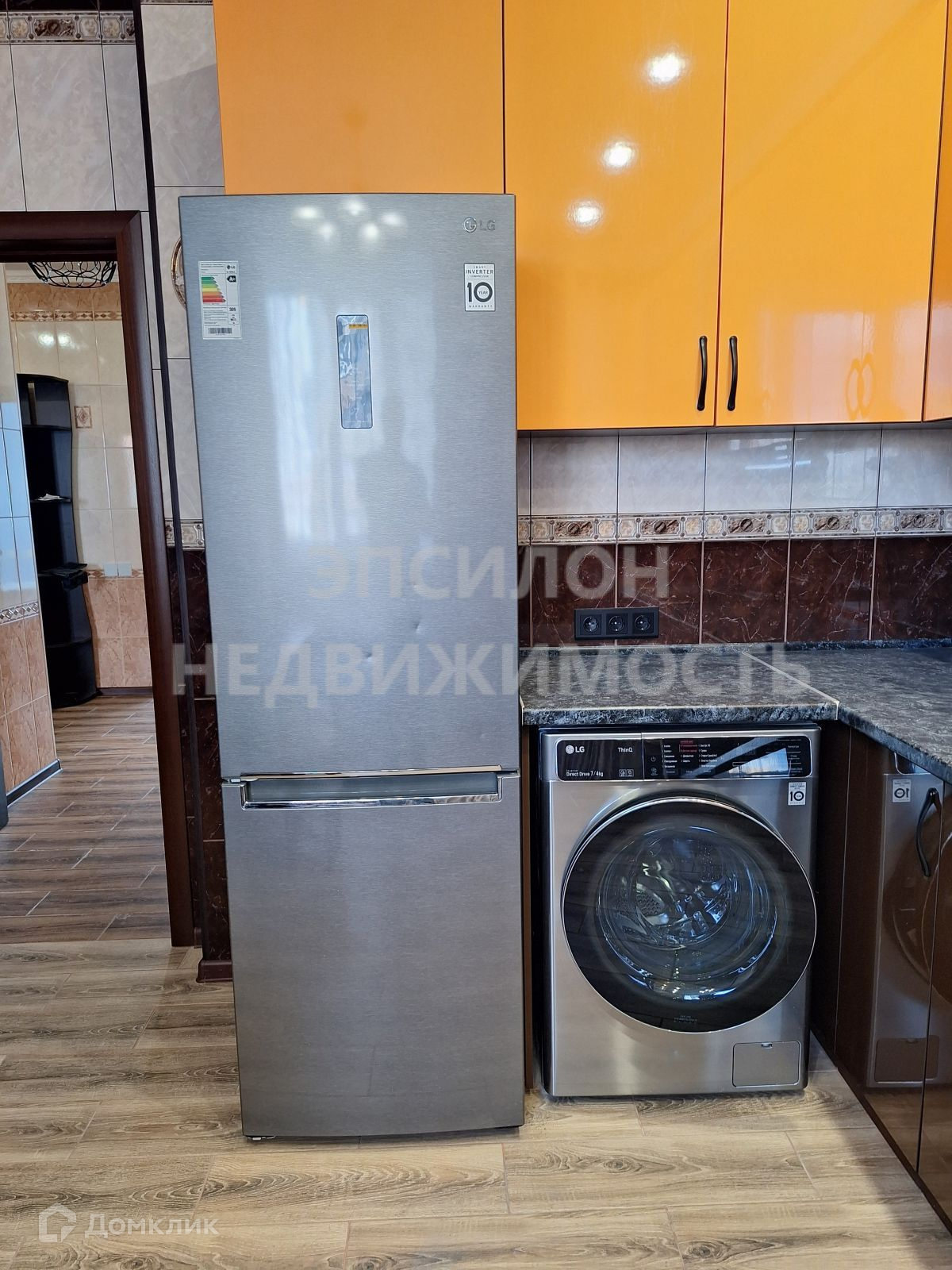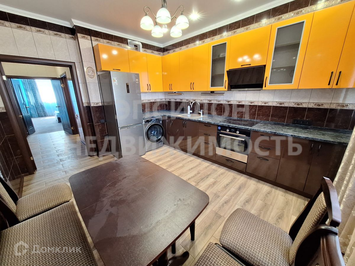 Кухня: Стиральная машина, Холодильник , кухонная мебель и техника (вытяжка, варочная поверхность, вытяжка), стол, кухонный уголок и стулья.