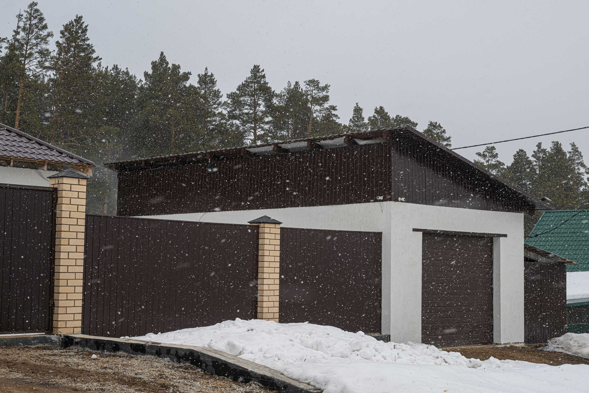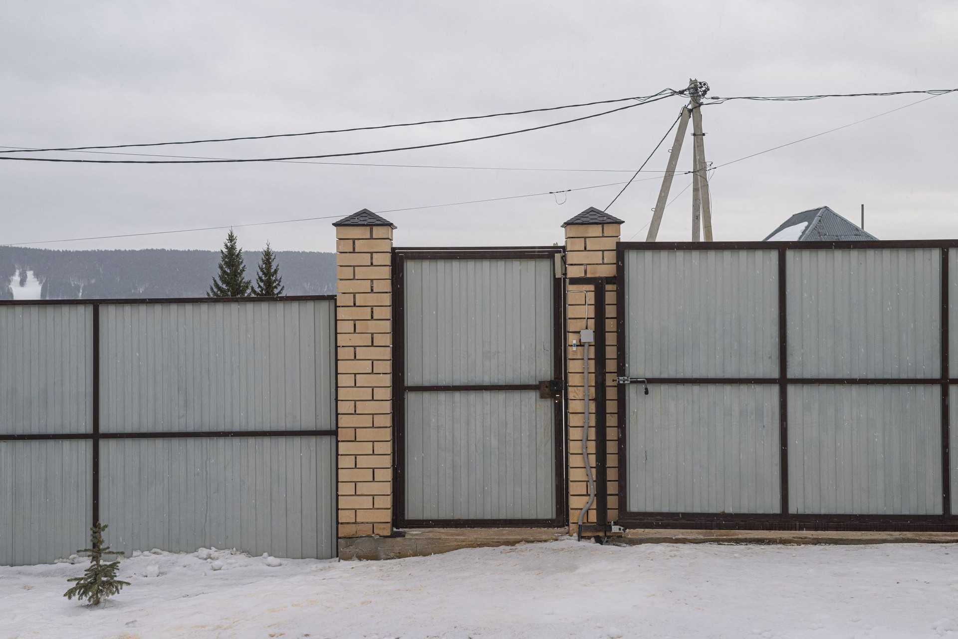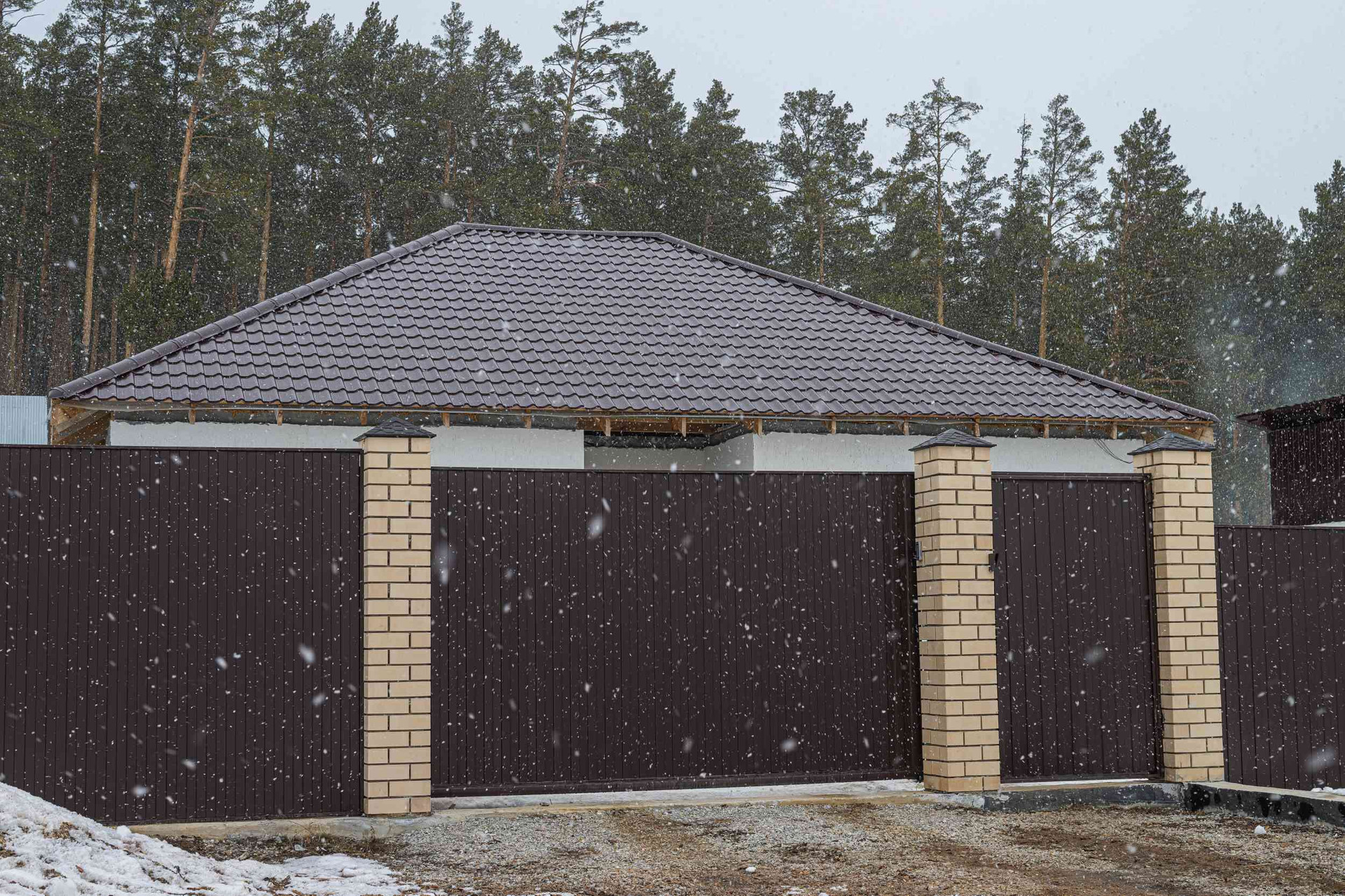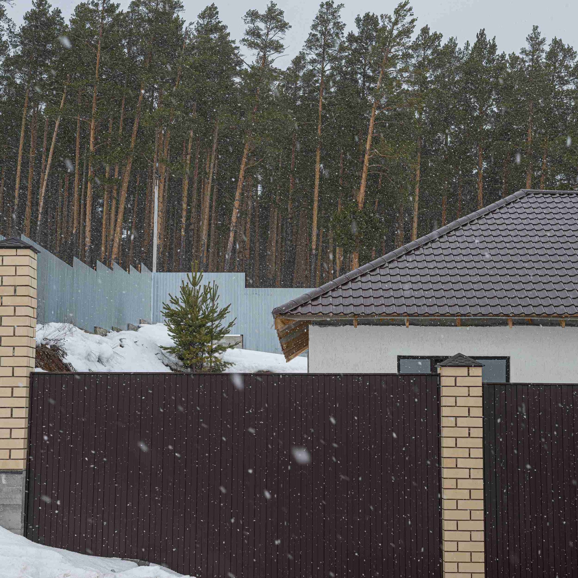 Высокий забор из профильного железа  с фундаментом по всей территории.