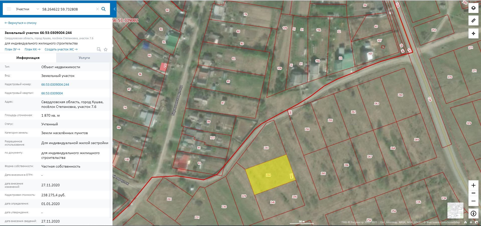 Категория земель: земли населенных пунктов, разрешенное использование: для ИЖС. Кадастровая стоимость 238.275 руб Кадастровый номер: 66:53:0309004:244. Единоличная собственность.