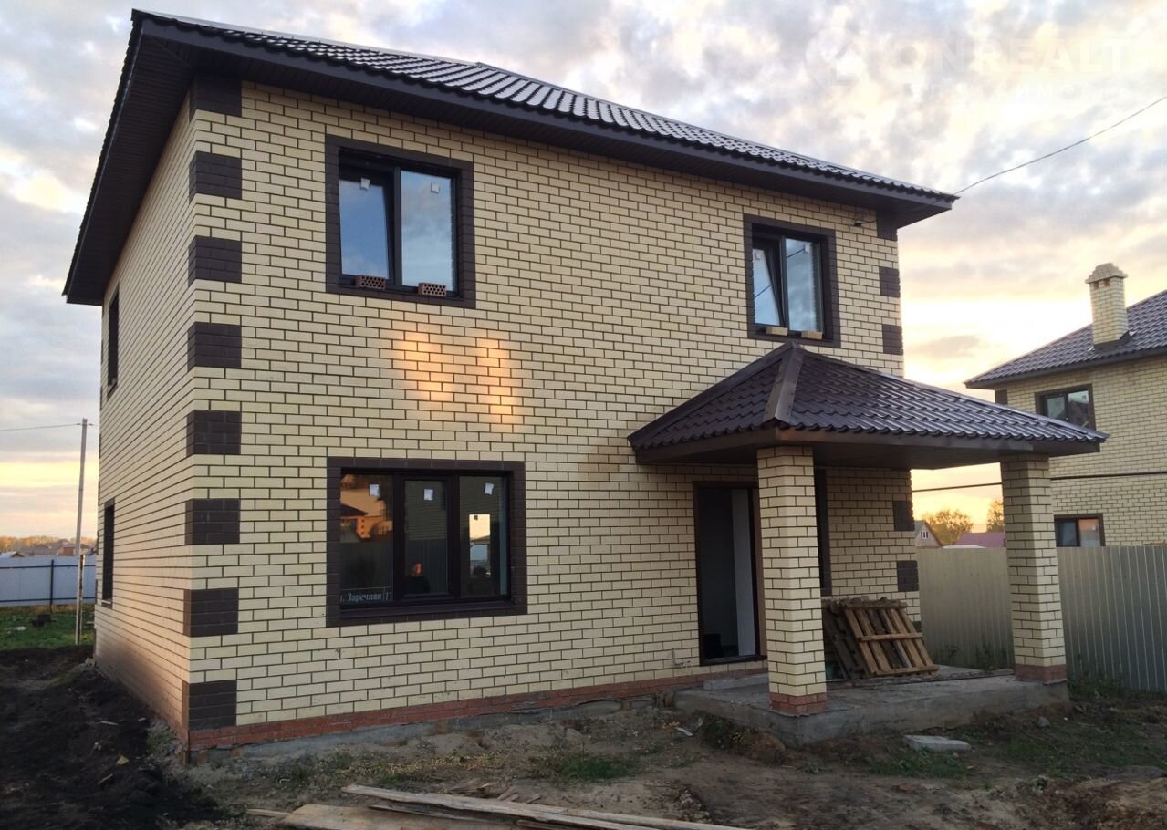 Cтены: газoбетонoблoк + oблицoвoчный кирпич белoгo цвета с кoричнeвыми вcтaвками