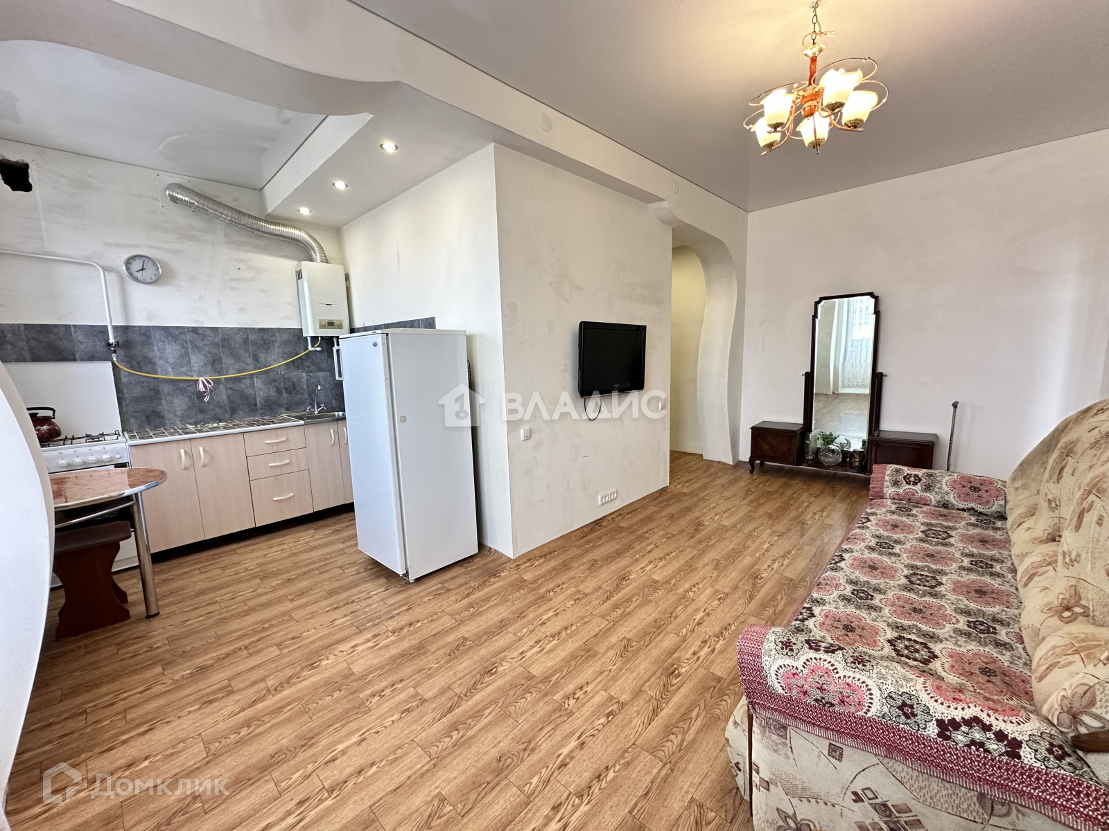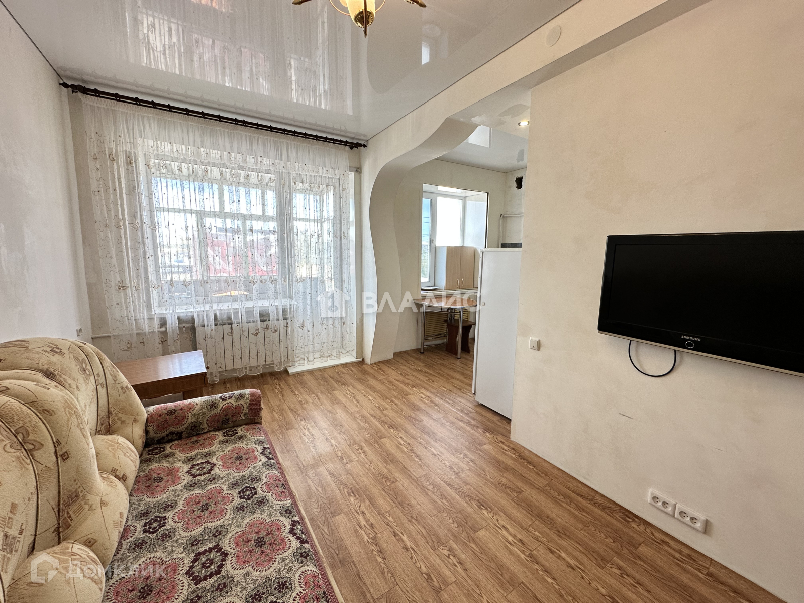 - Потолки: натяжные - коридор, кухня, гостиная. в комнате - заштукатурены, загрунтованы и побелены.