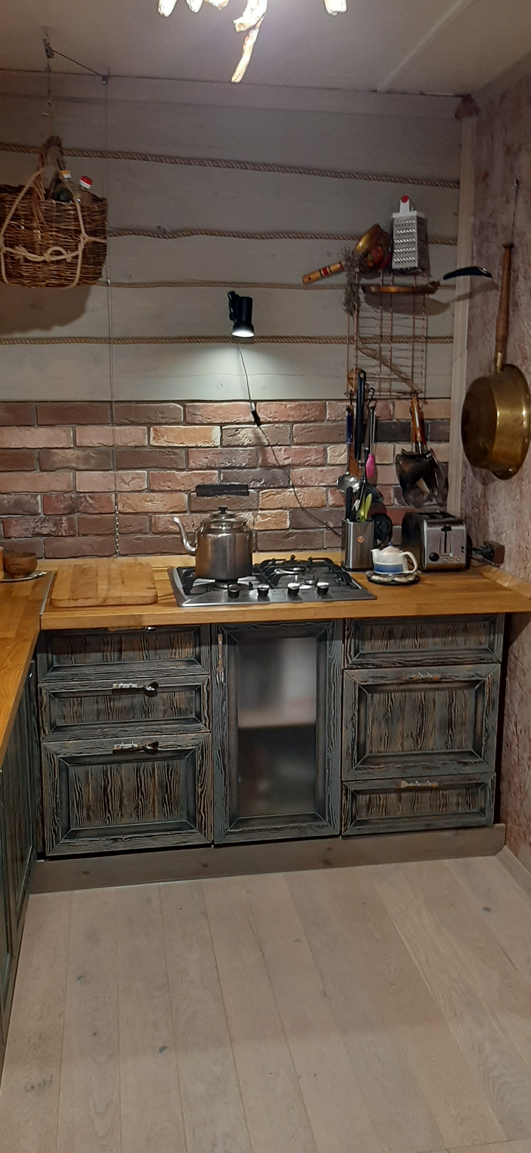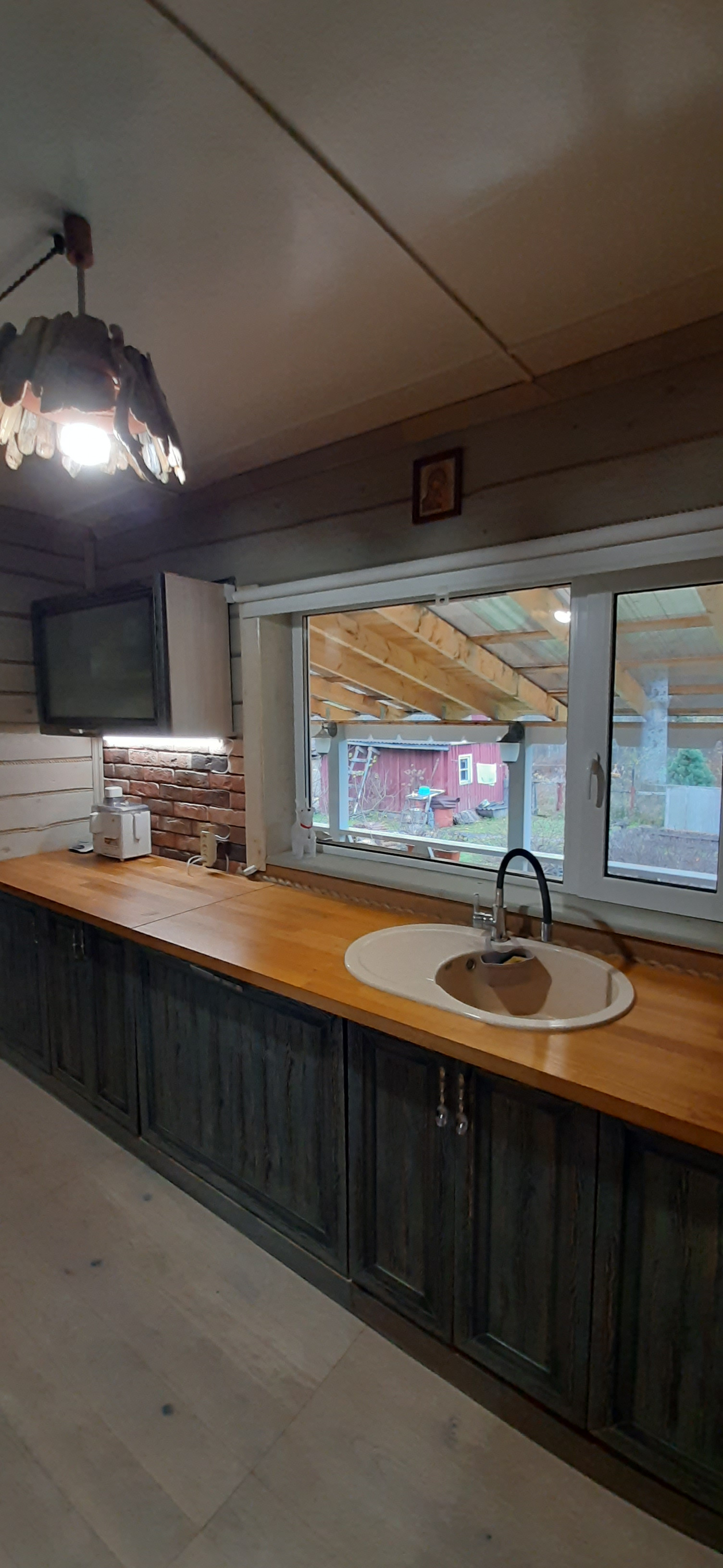 На первом этаже просторная гостинная с выходом на открытую террасу, кухней, комнатой. Санузел с сауной  и душевой кабинкой.