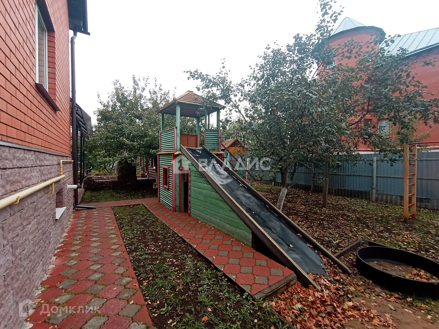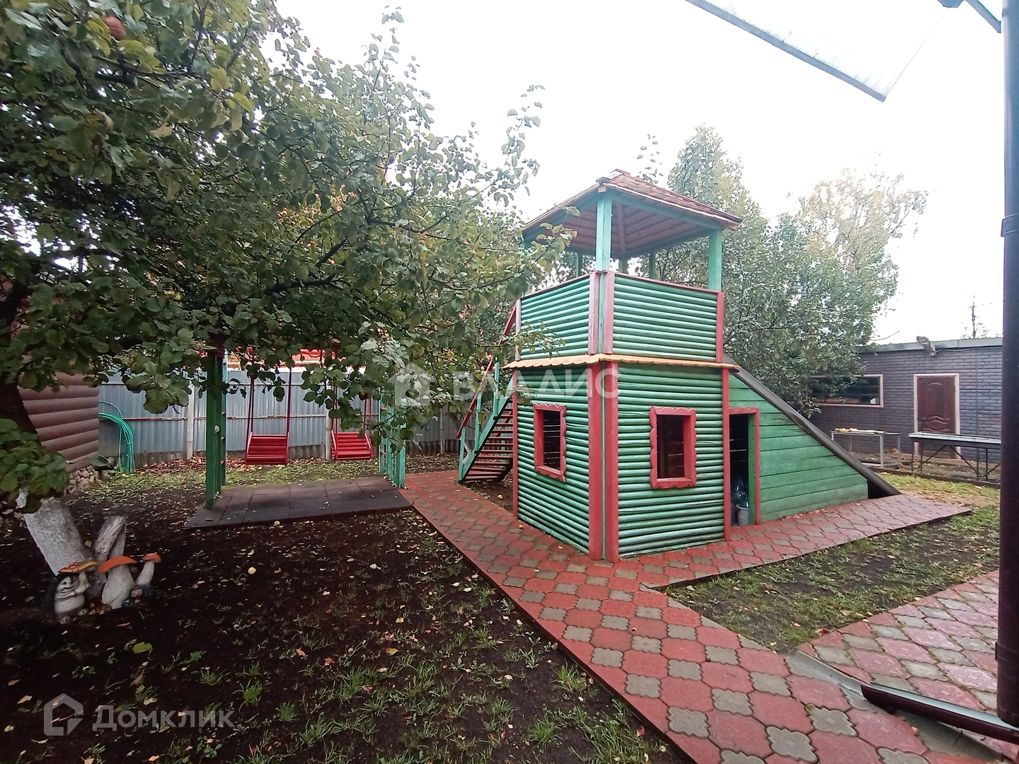 Детская площадка с качелями и горкой.