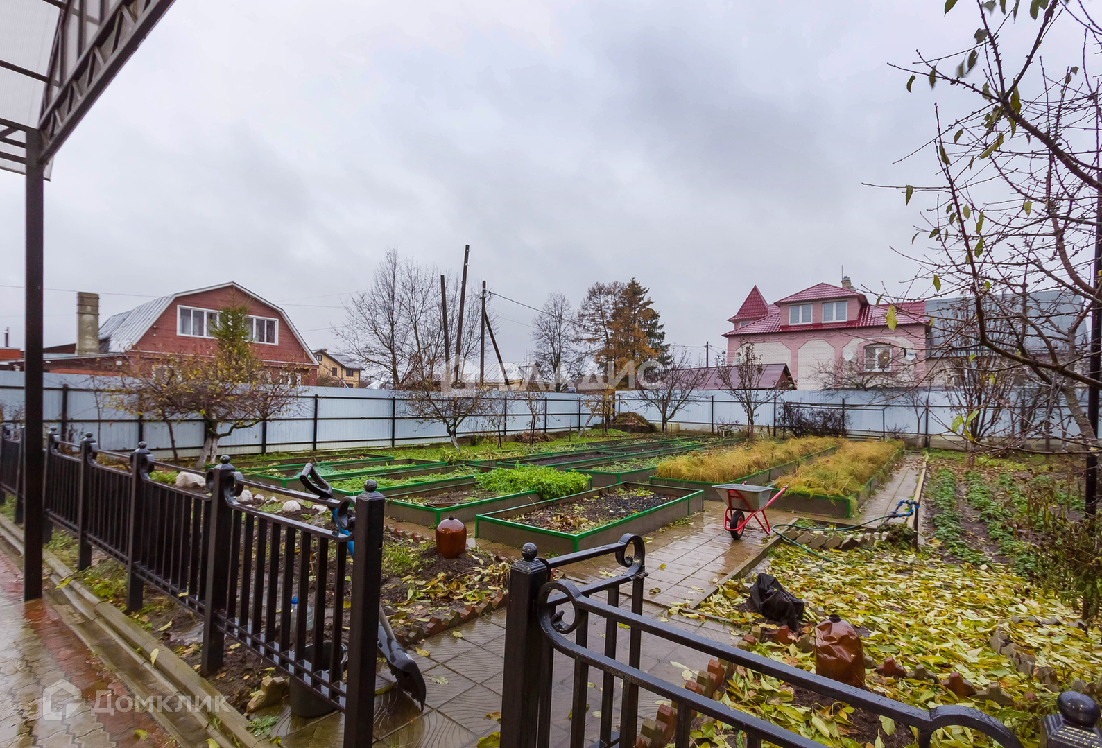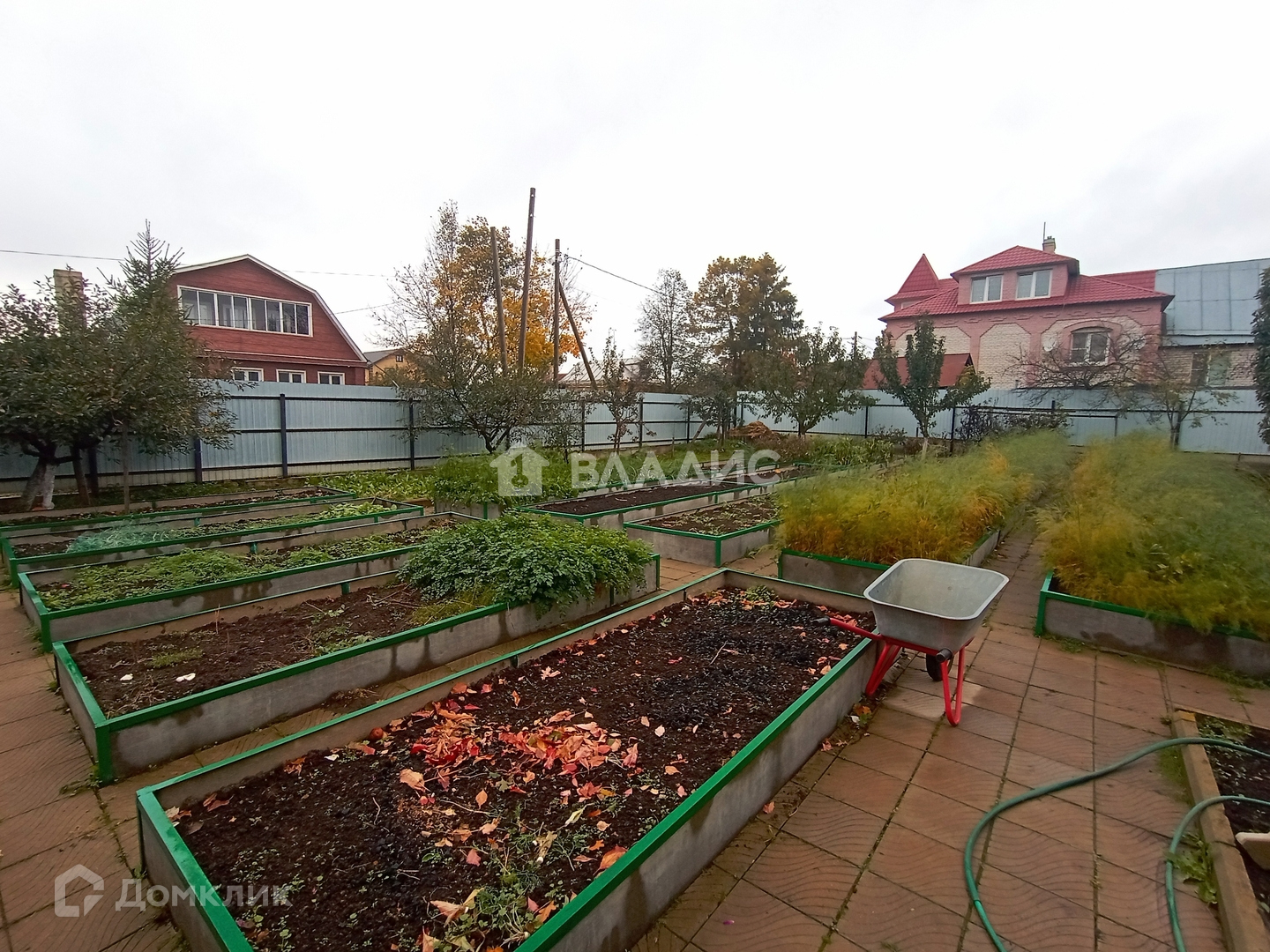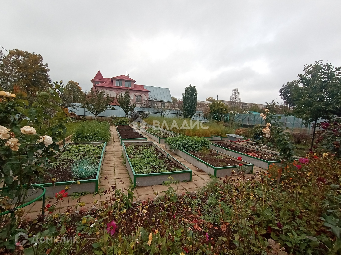 В идеальном состоянии - высокие грядки из профиля и плит, дорожки - плитка. На участке много плодовых деревьев и кустарников. Имеется вишневый сад. Отдельно выделенные места под выращивания малины и винограда.