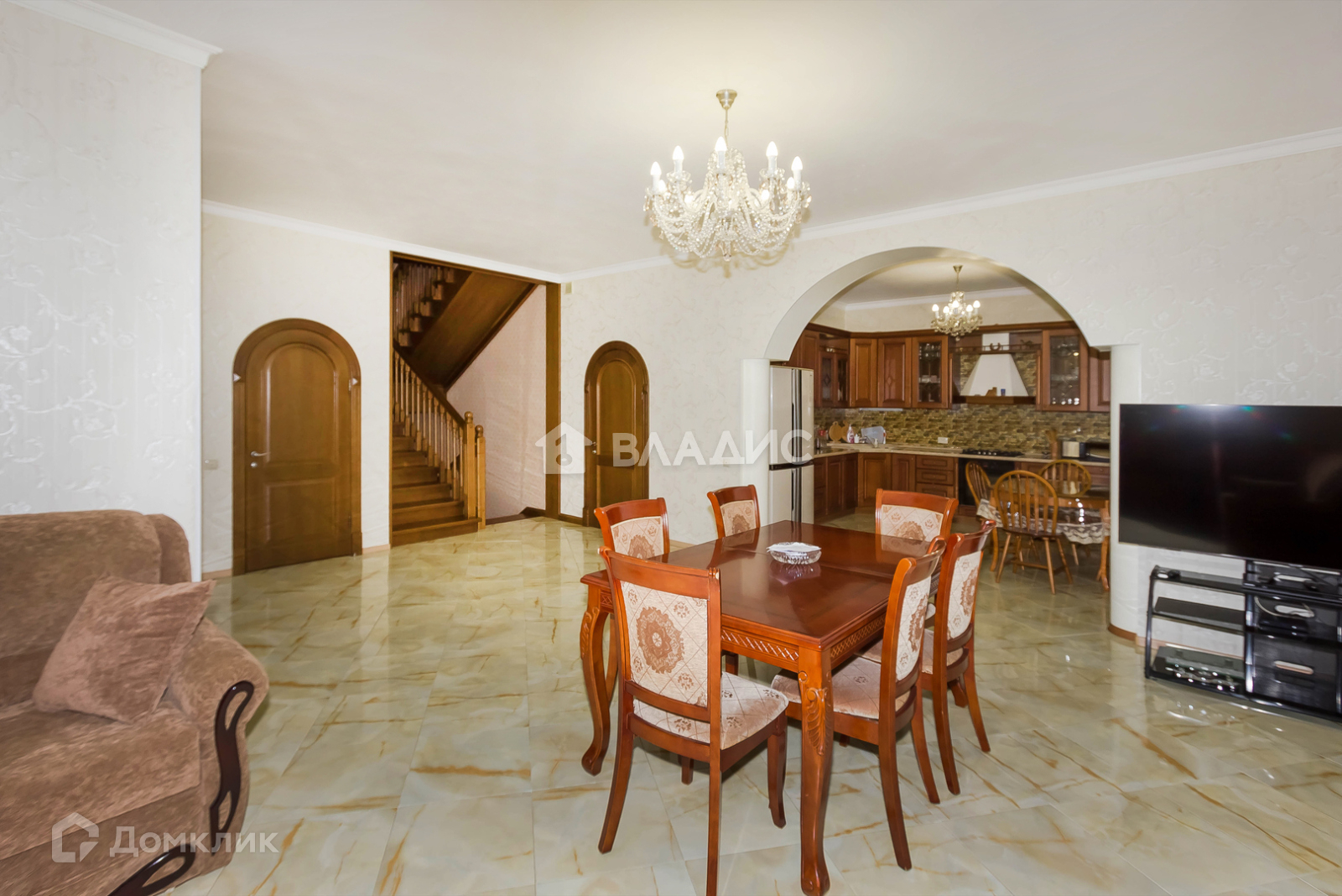 На первом этаже кухня с дорогой техникой, гостиная, комната (17.8 кв.м.), санузел. Пол на первом этаже выложен плиткой, теплый пол. дубовые двери.