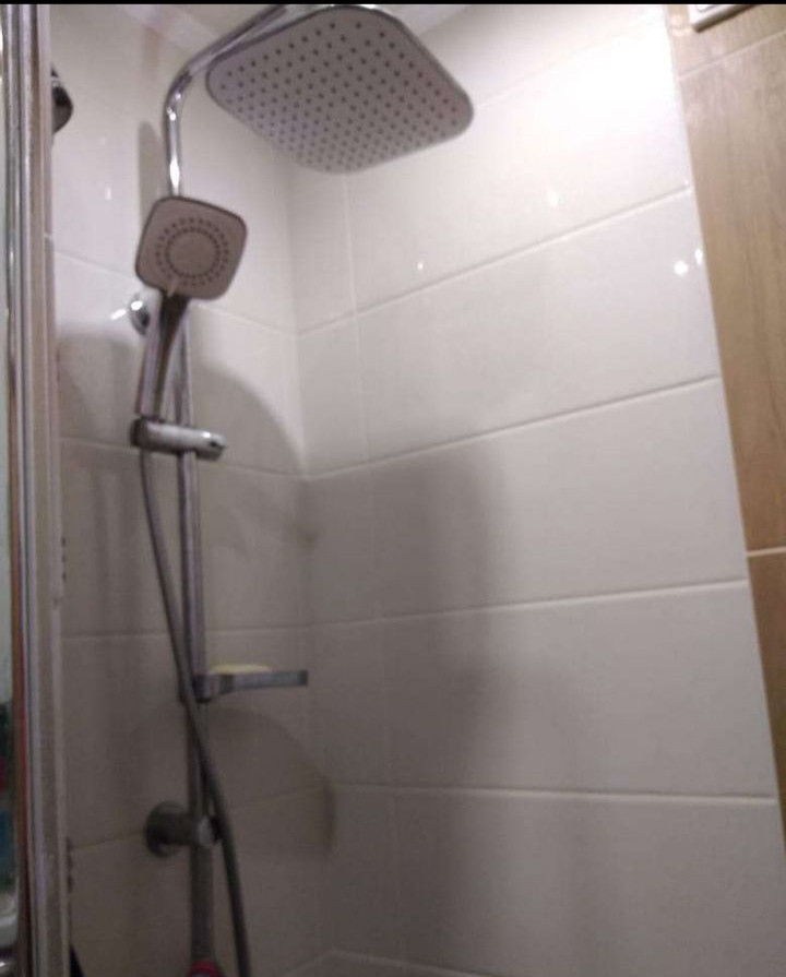 В ванной душевая из плитки, дверь стекло, тропический душ.
