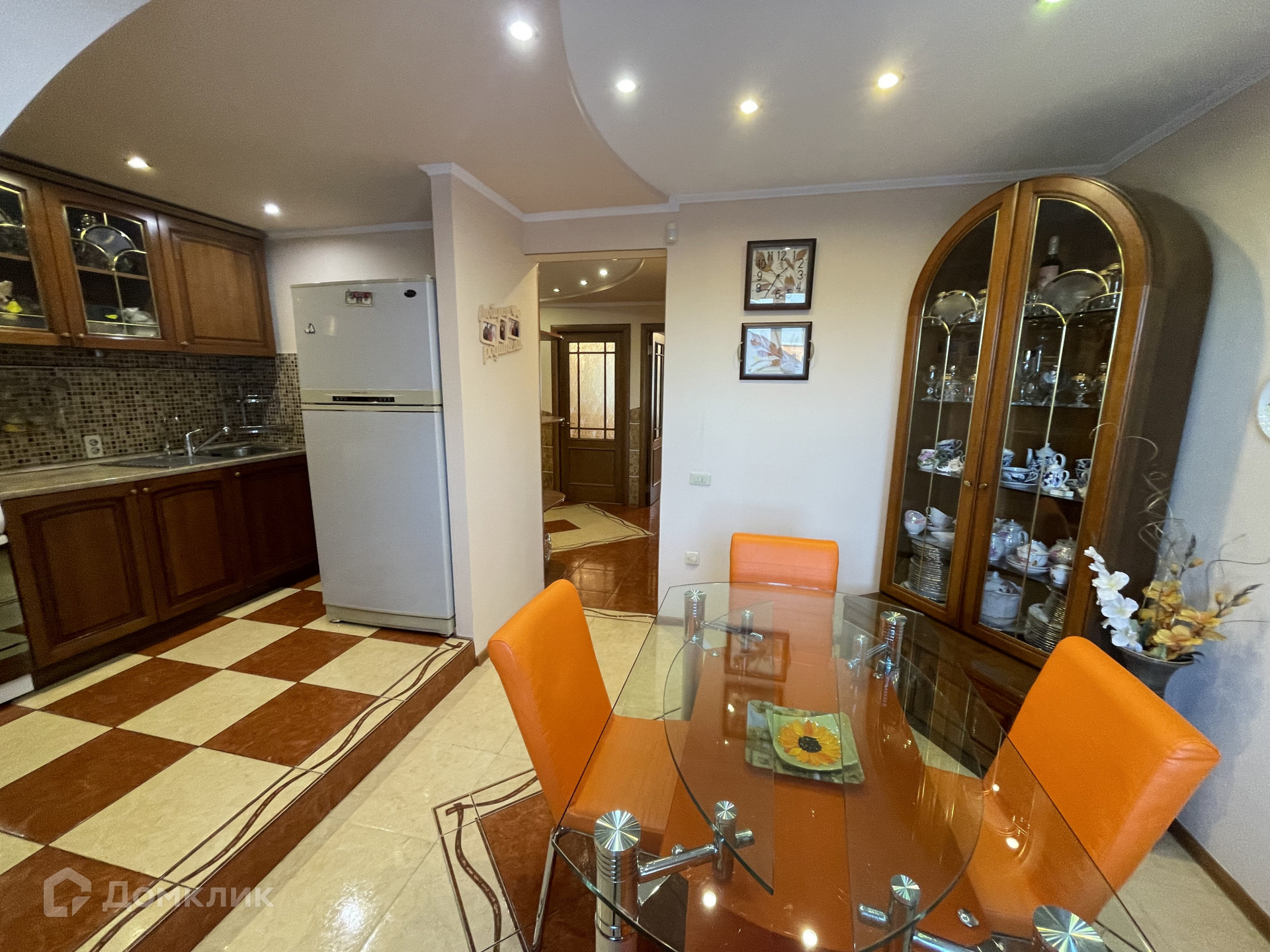 • S=112,6 м², площадь кухни - 14,8 м², 3/5 этаж. Кирпичный дом, 1996 года постройки. Дизайнерский евроремонт. Комнаты изолированные. Окна ПВХ (на две стороны), с большой застекленной лоджией - 6,4 м². Полы: столовая и прихожая - плитка, в остальных комнатах - ламинат. Разноуровневые потолки из гипсокартона с нишами под светильники. Стены ровные, оклеены качественными дорогими обоями. Межкомнатные двери из натурального дерева. Два совмещенных санузла. Входная дверь металлическая (двойная). Состояние подъезда - отличное. Подключен интернет и видеонаблюдение на площадке подъезда. Приличные соседи.