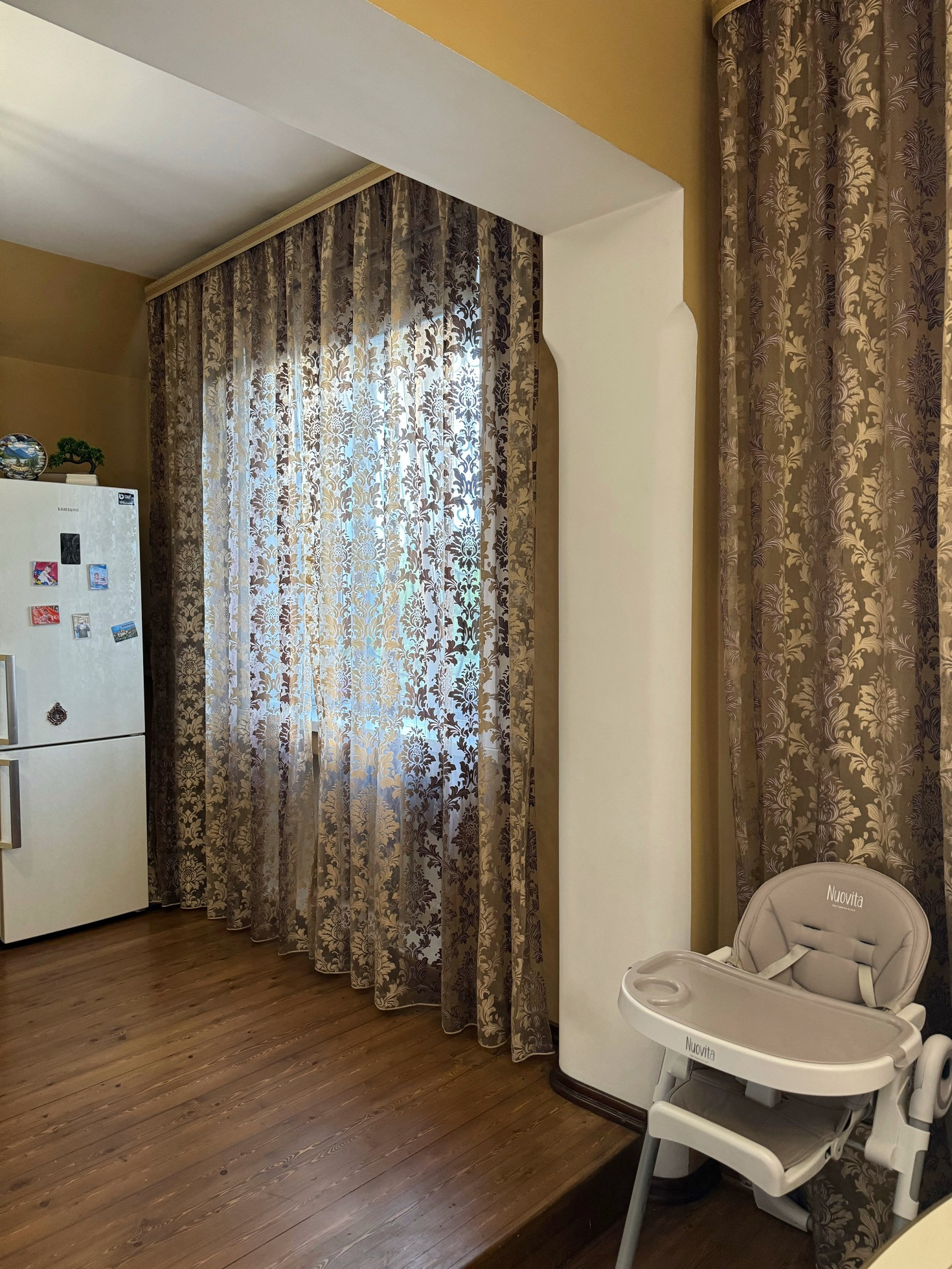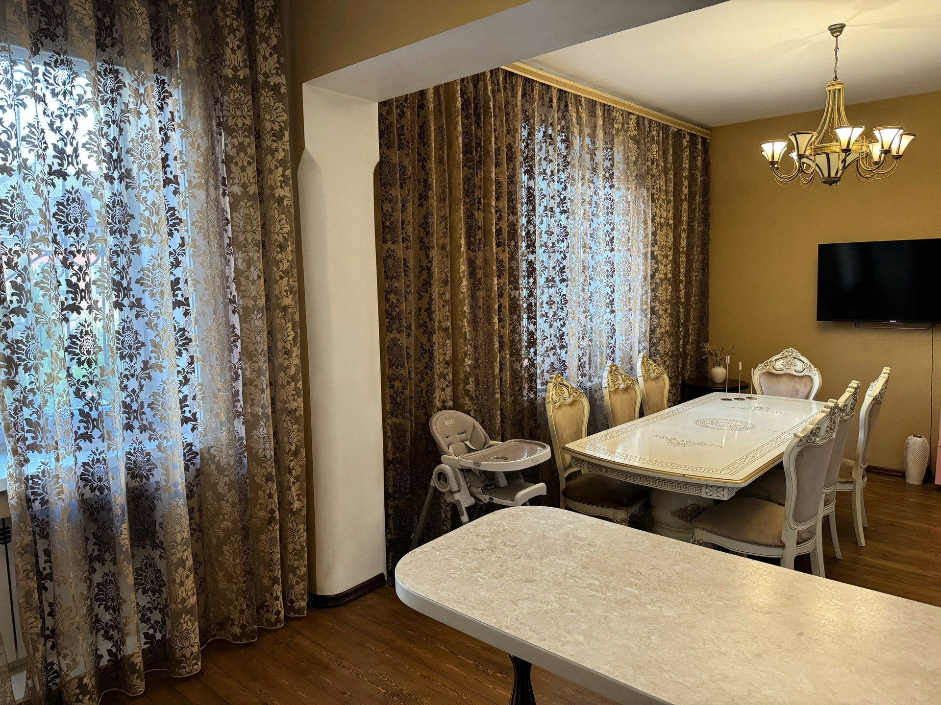 В квартире светло, просторно, тепло зимой, прохладно летом, большие окна, высокие