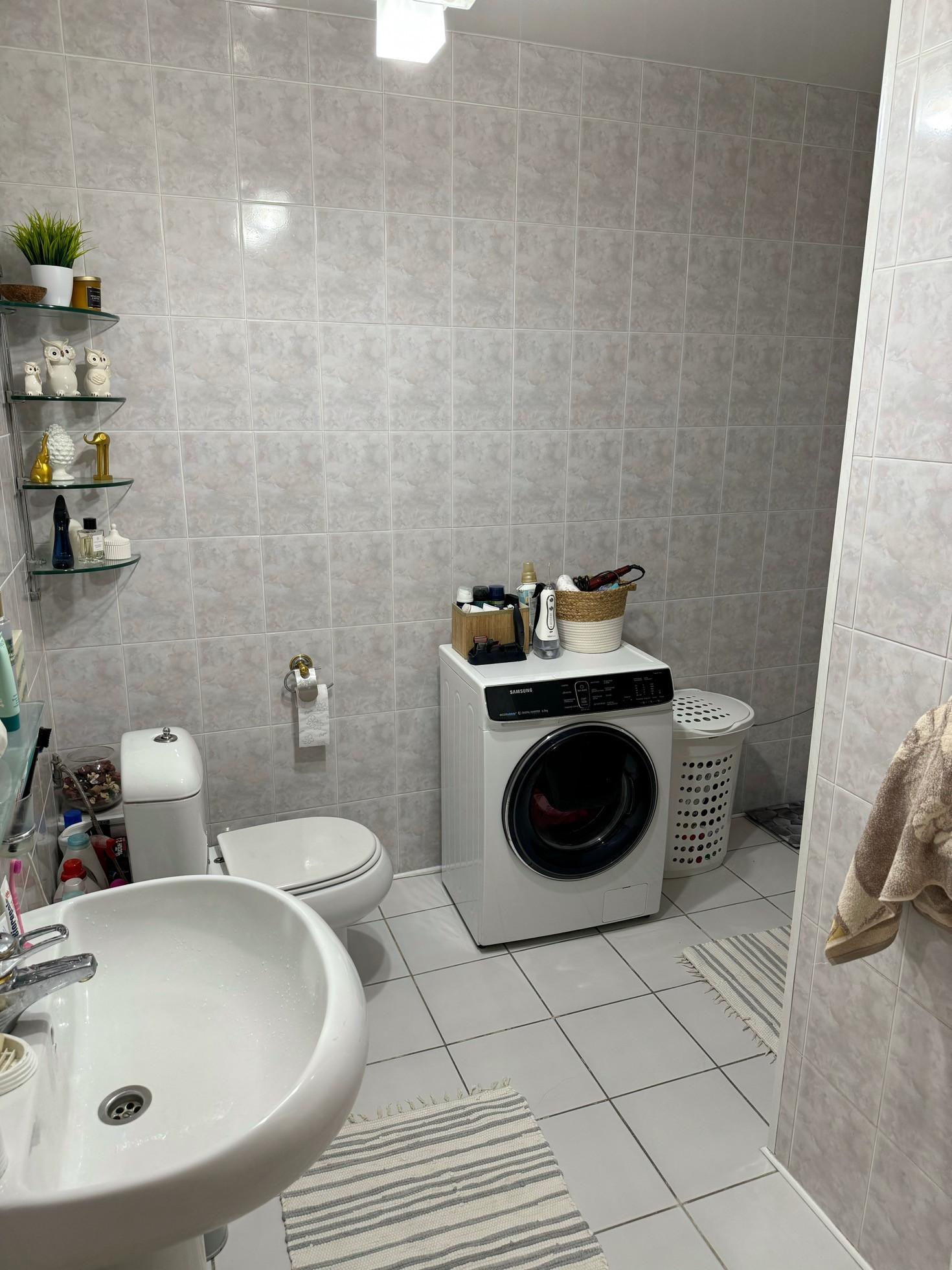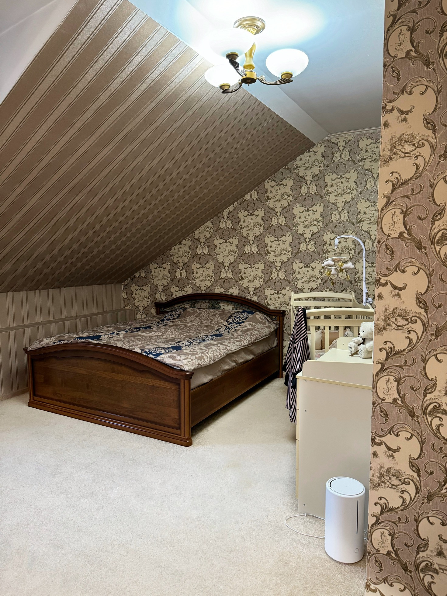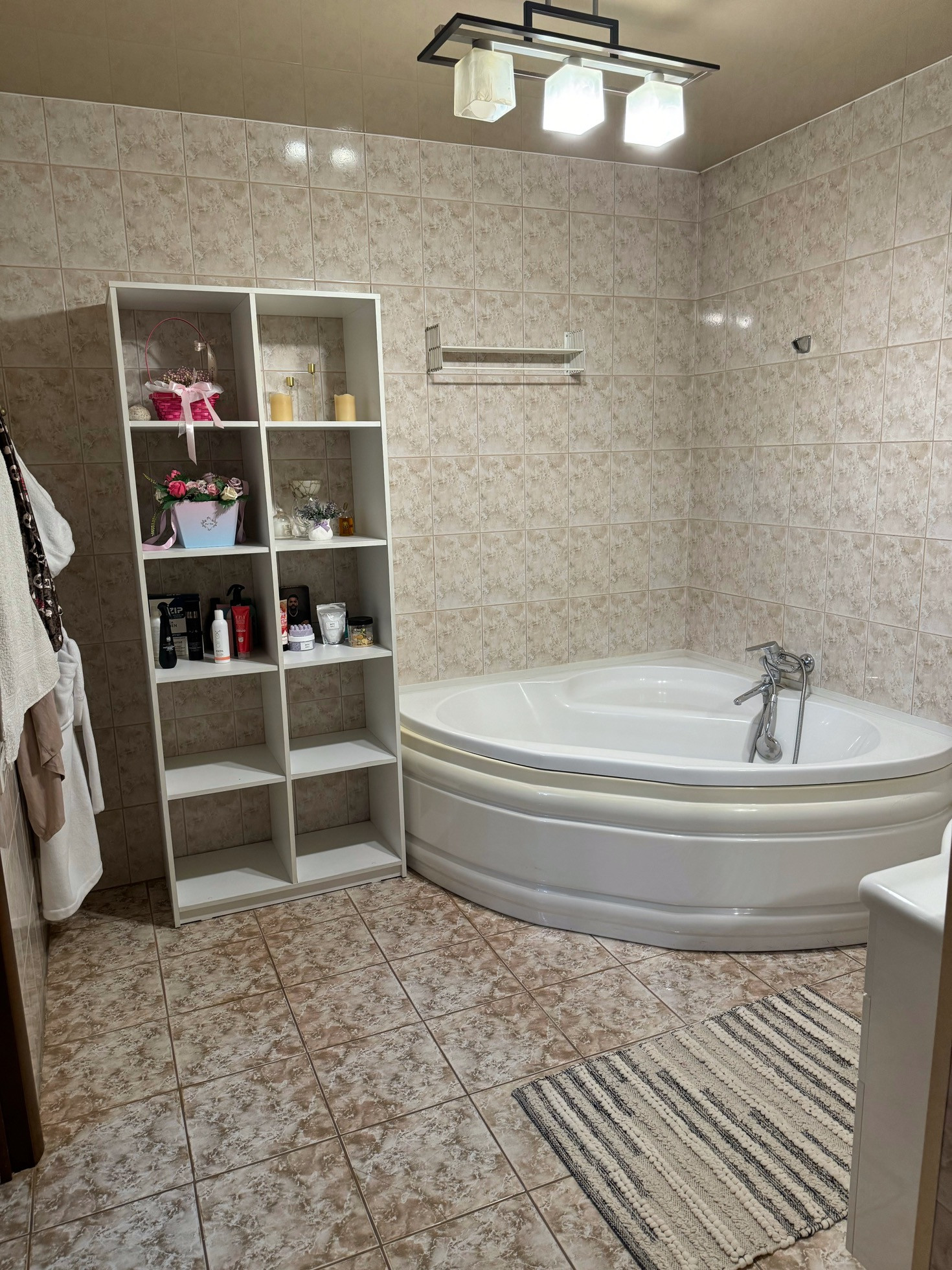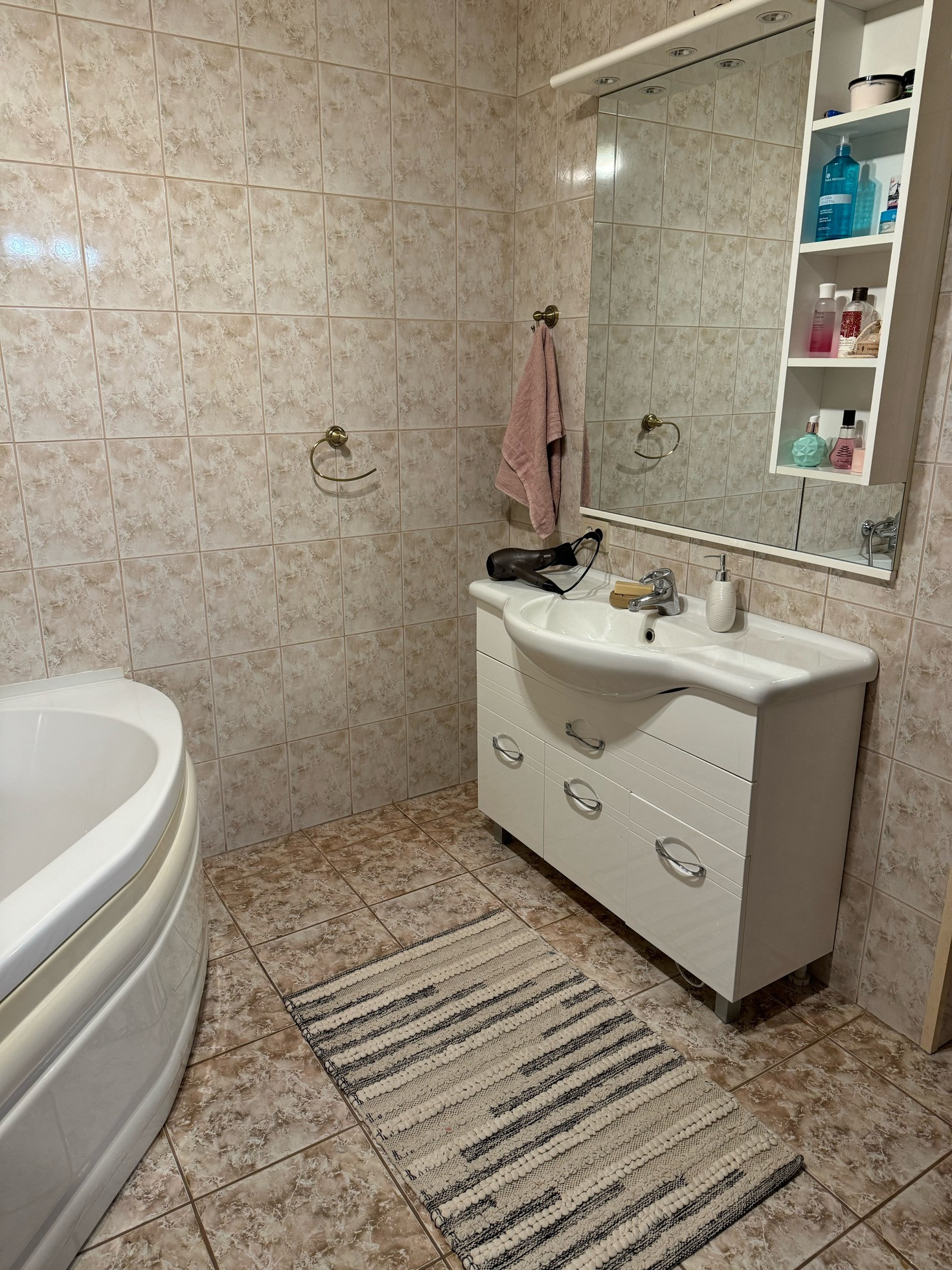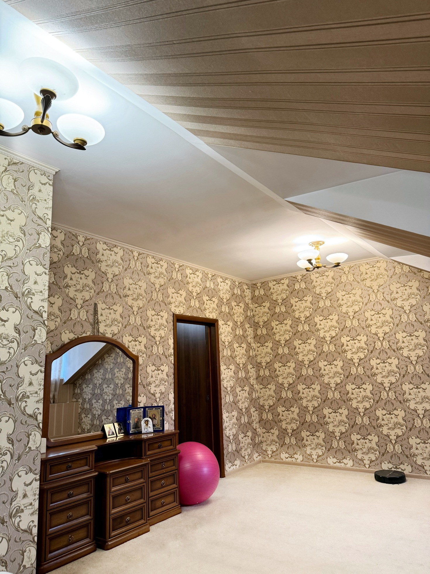 Стены обои, пол ковровое покрытие, потолок навеснои 1, ванная-натяжной, теплый пол в ванной комнате .